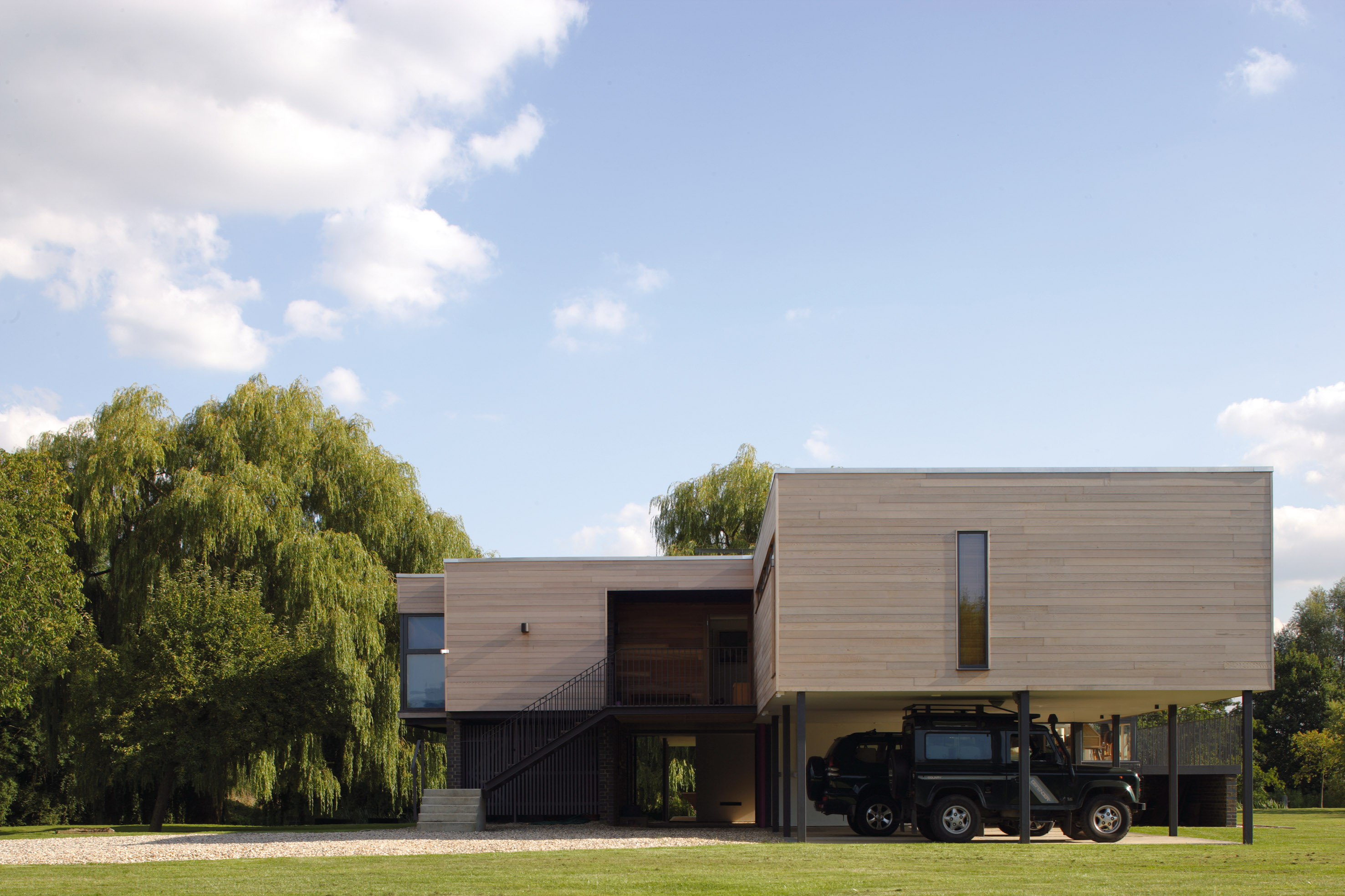 The house is raised up on steel columns due to the flood risk as the site is located on the junction of two rivers. The original plan of the house is based on the configuration of two squares, one for sleeping the other for living.