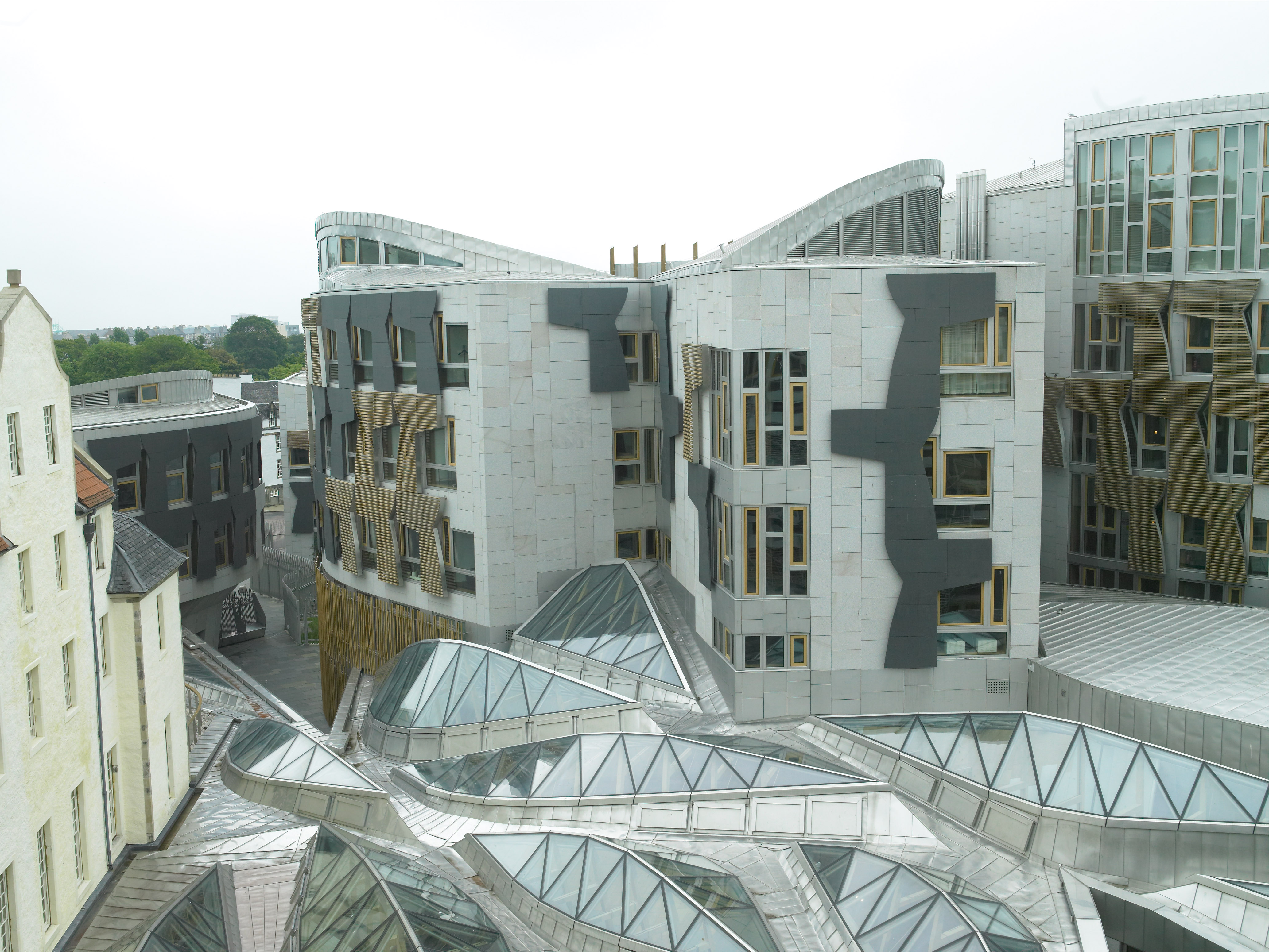 Complex incorporating a debating chamber building, four tower buildings containing committee rooms, staff offices, the MSP building and the Canongate buildings