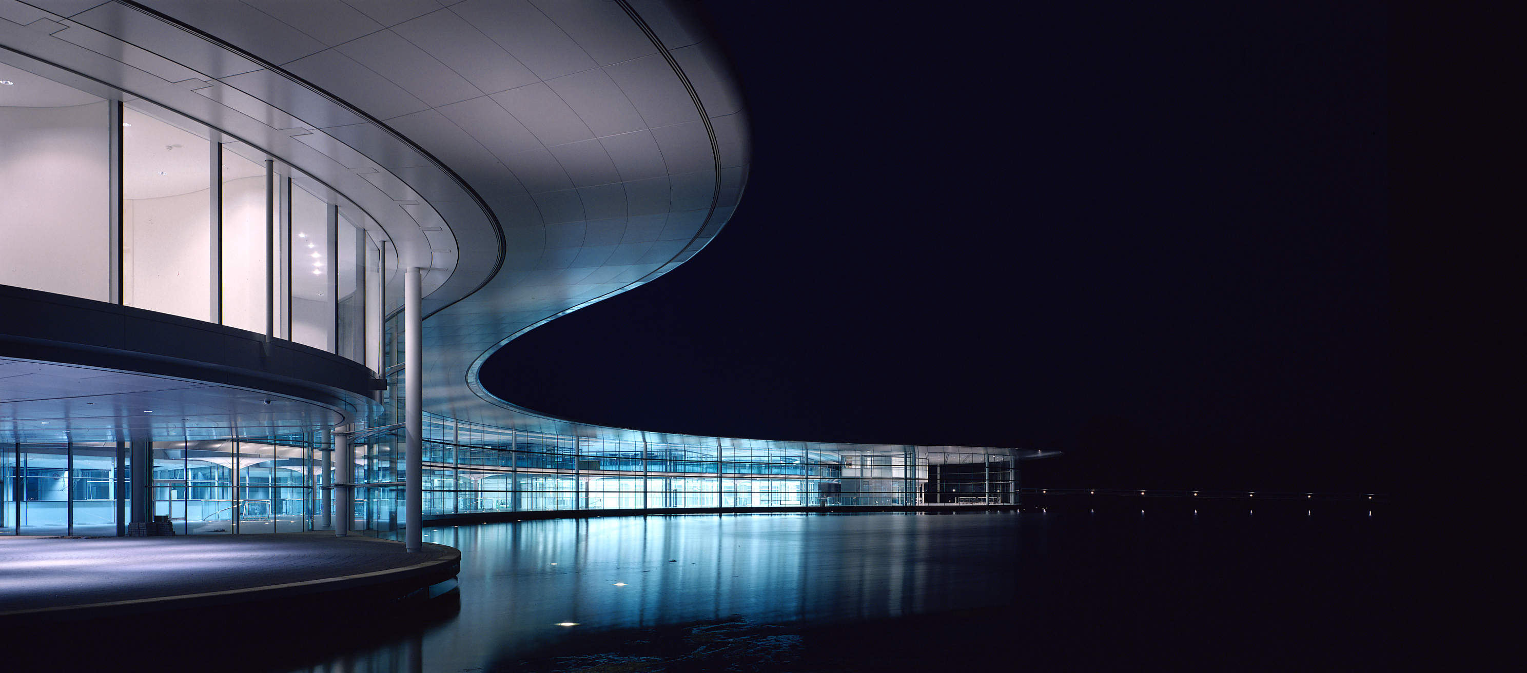 Roughly semi-circular in plan, the McClaren Technology Centre includes design studios, laboratories, testing and production facilities. A formal lake completes the circular plan and forms an integral part of the building’s cooling system. The principal lakeside facade is a continuous curved glass wall shaded by a cantilevered roof.