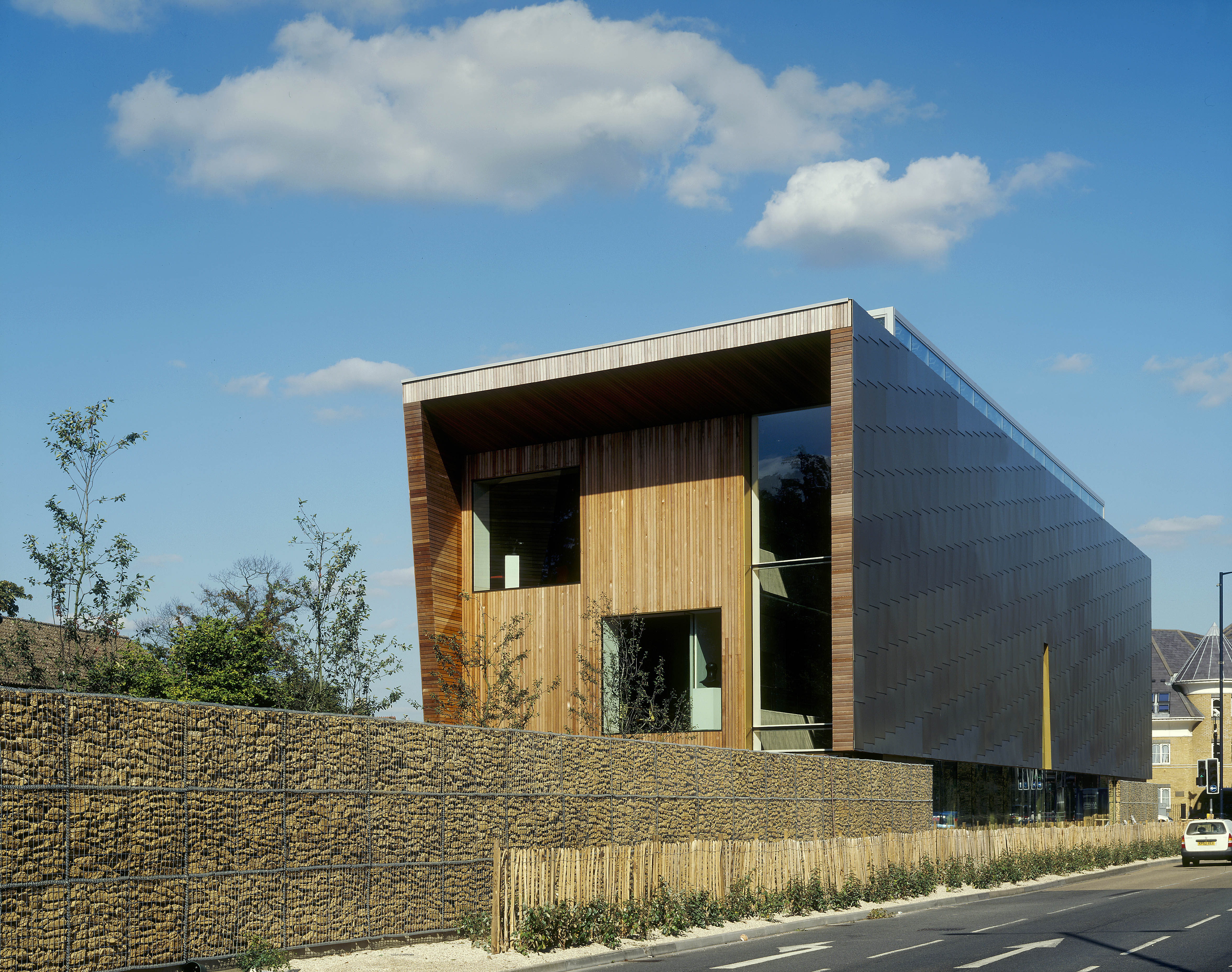 Square aluminium cladding panels step across the buildings façade in a diagonal pattern, further emphasised by the use of five different cladding bands in shades of silver and gold. Softer timber cladding is used away from the roadside and towards the gallery’s garden space.
