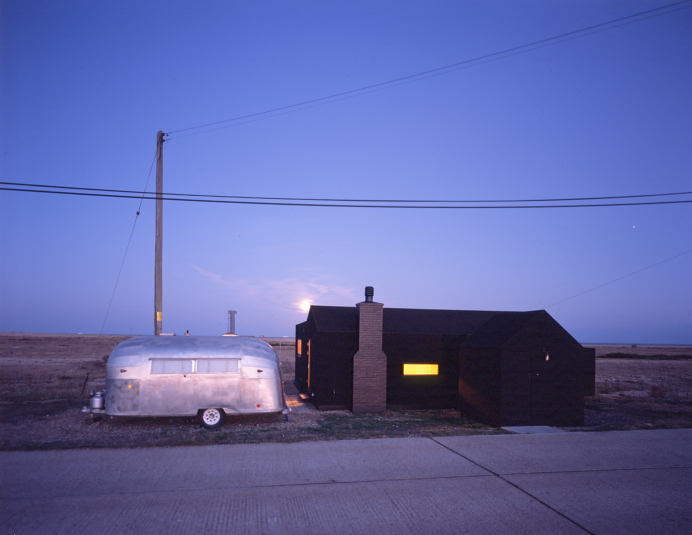 House on Dungeness Beach in Kent, clad entirely in black rubber; incorporates a freestanding 1956 Airstream caravan as visitor accommodation