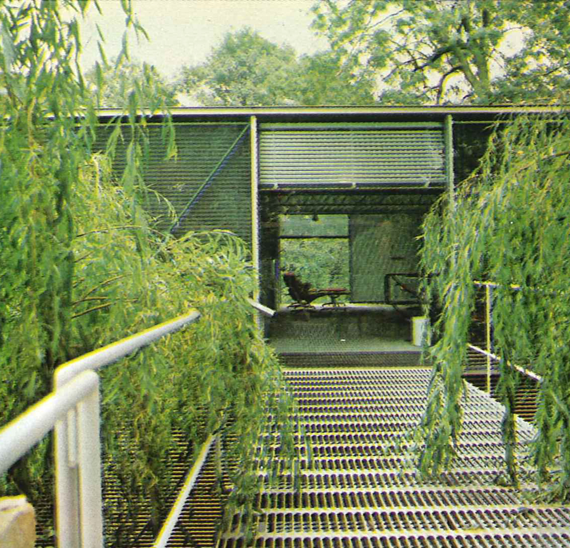 Metal decking for both the floors and roof is supported on a two-way grid of lattice trusses. Side walls are of insulated sandwich panels with full-height sliding glass doors comprising the front and rear facades.
