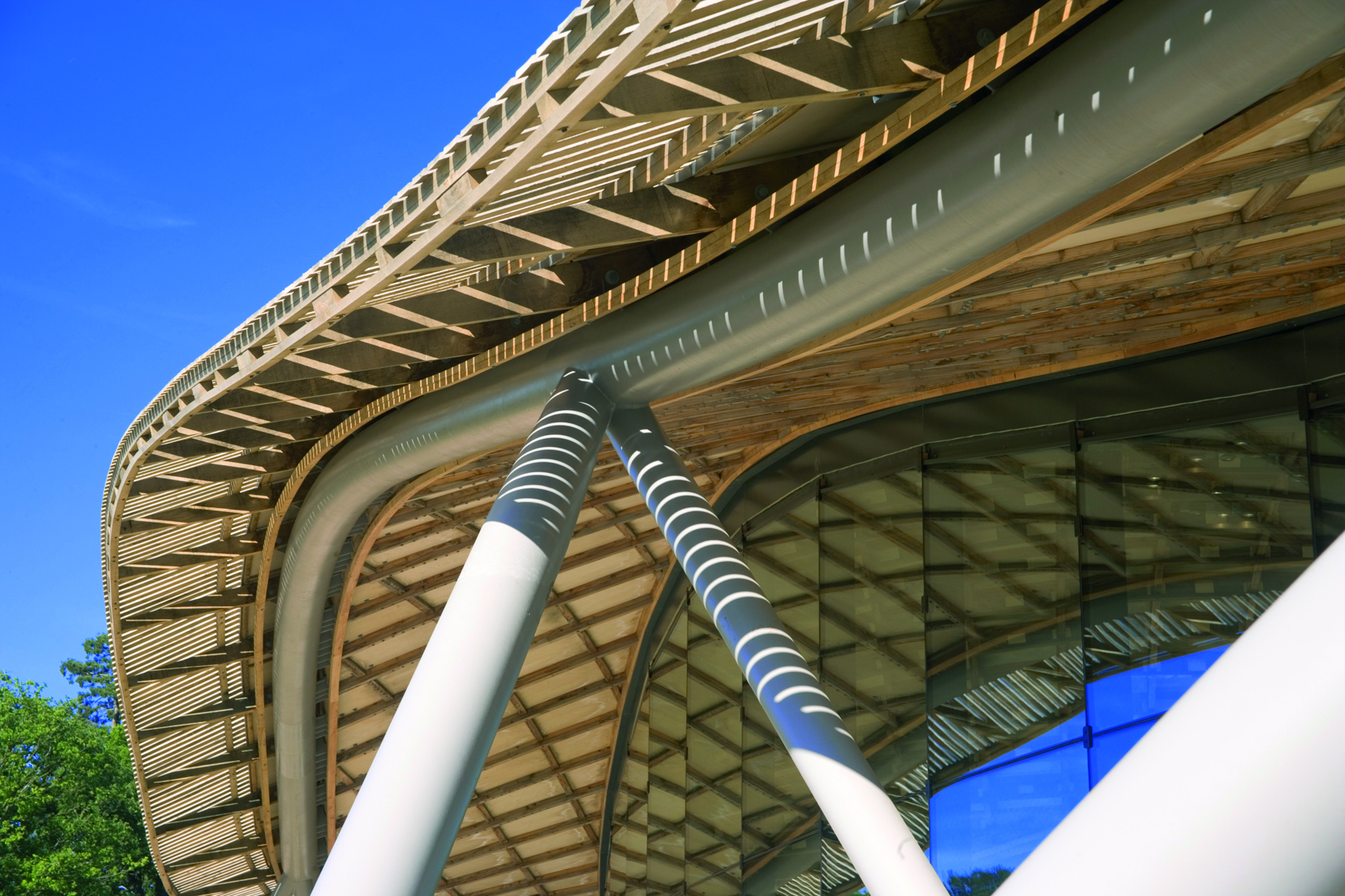 The Savill Building is designed as three domes which are sinusoidal and ultra slim in elevation. Its dramatic curved form combines contemporary engineering with traditional craft skills. The ‘gridshell’ roof derives its strength from the grid of its structure and the double curvature of its form and cladding.