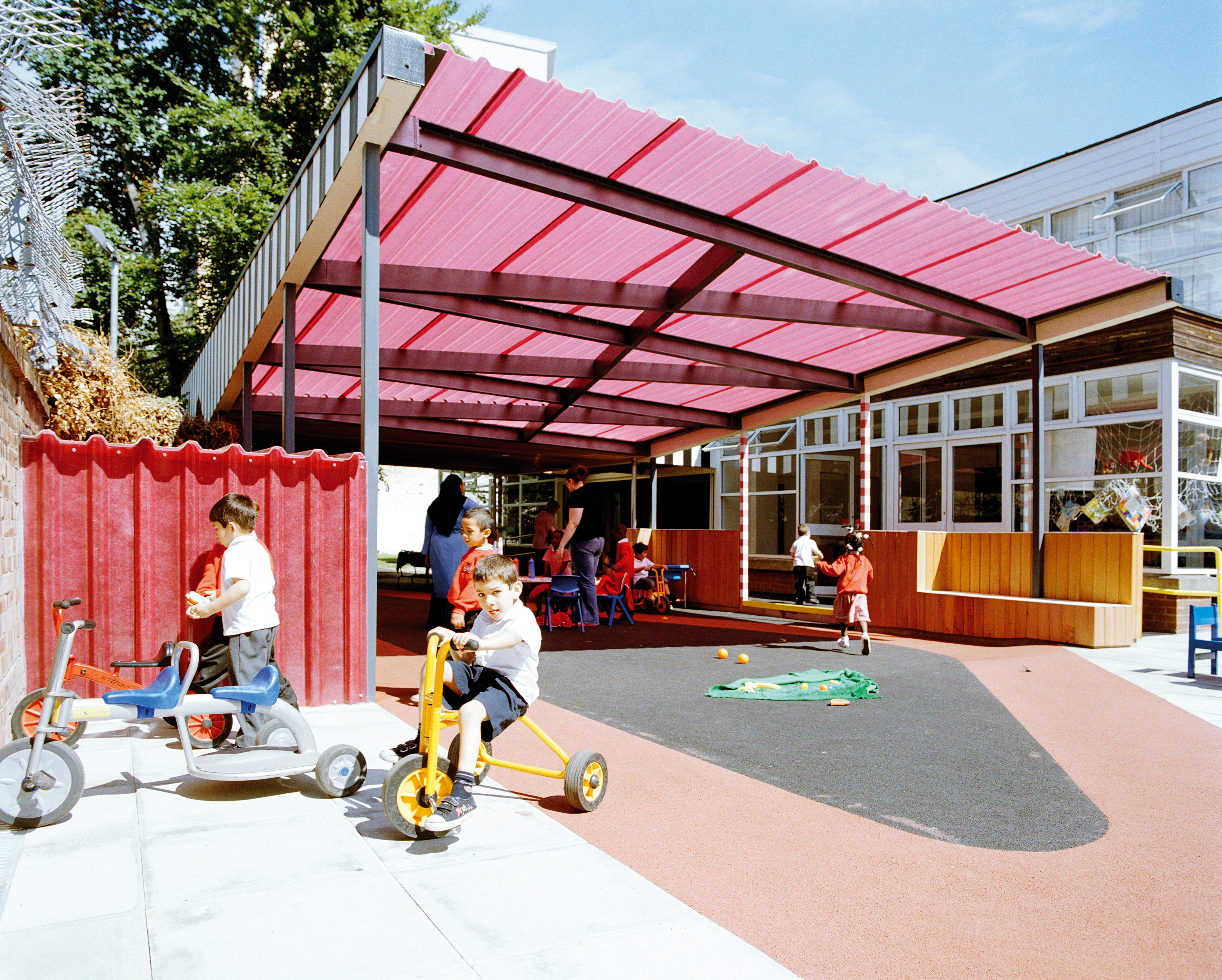 The outdoor play area is covered by an up-tilted pink glass-reinforced plastic canopy. The steel joists are rectilinear in the role-play room and its projecting roof, but zig-zag outside to support the pink canopy and its black-and-white striped bargeboards.