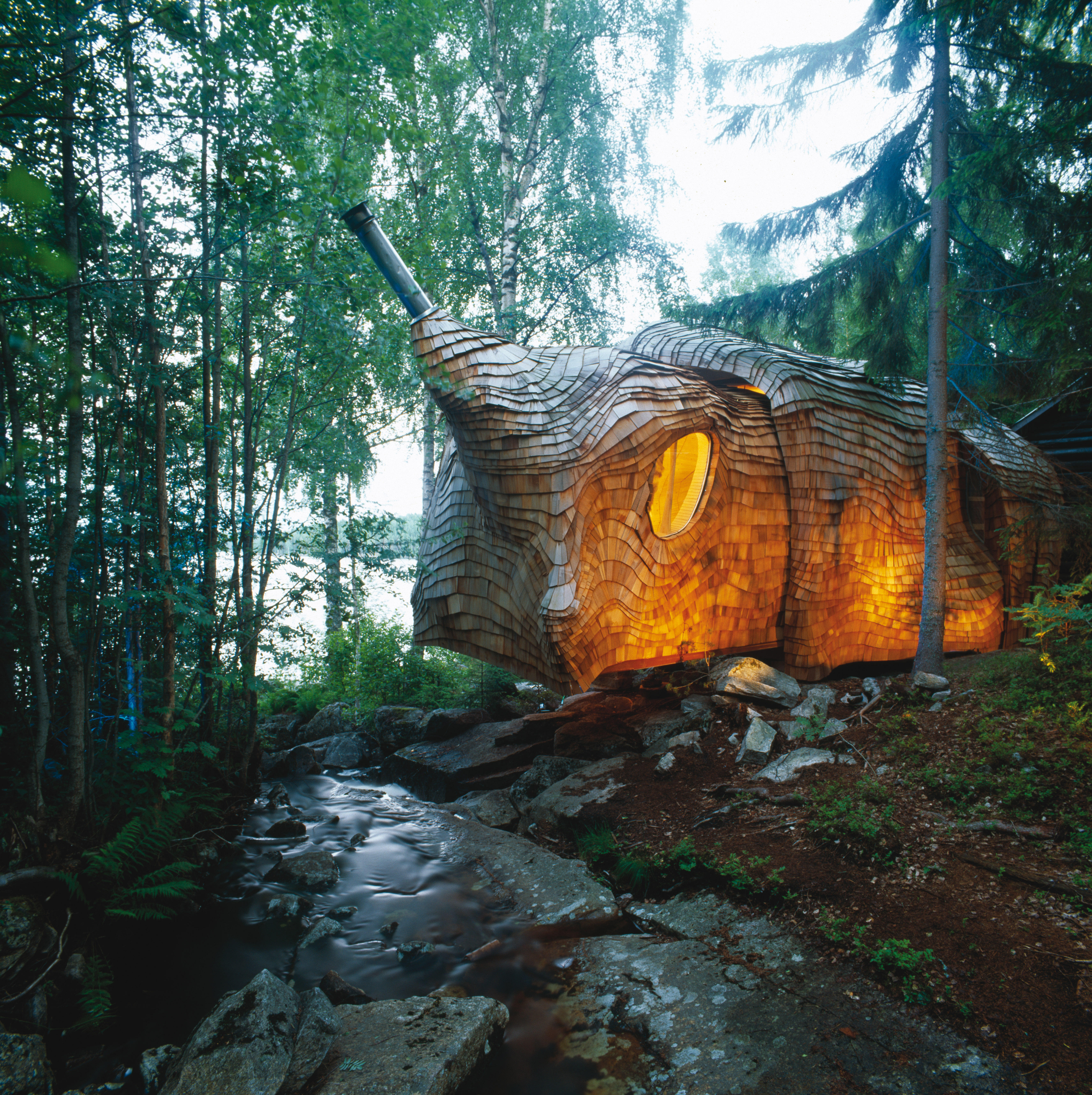 Renovation of a cabin in Sweden including the addition of a retractable extension which, when expanded, cantilevers over a stream