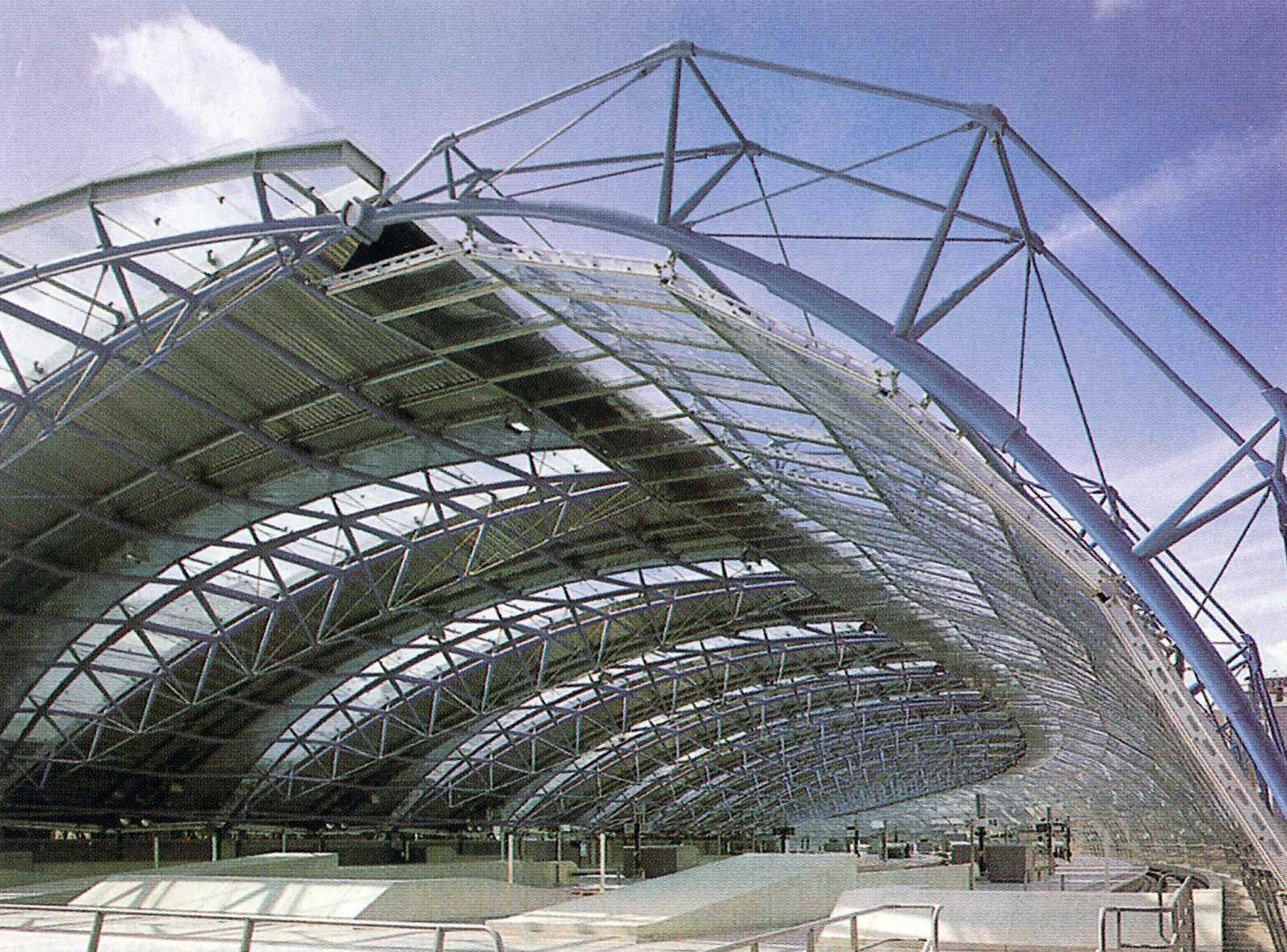 The roof takes the form of a flattened, three-pin, bow string arch, with the centre pin moved to one side. The cladding system is flexible, with variably sized sheets of glass placed in an overlapping configuration that can flex and expand in response to the roof's various twists and turns.