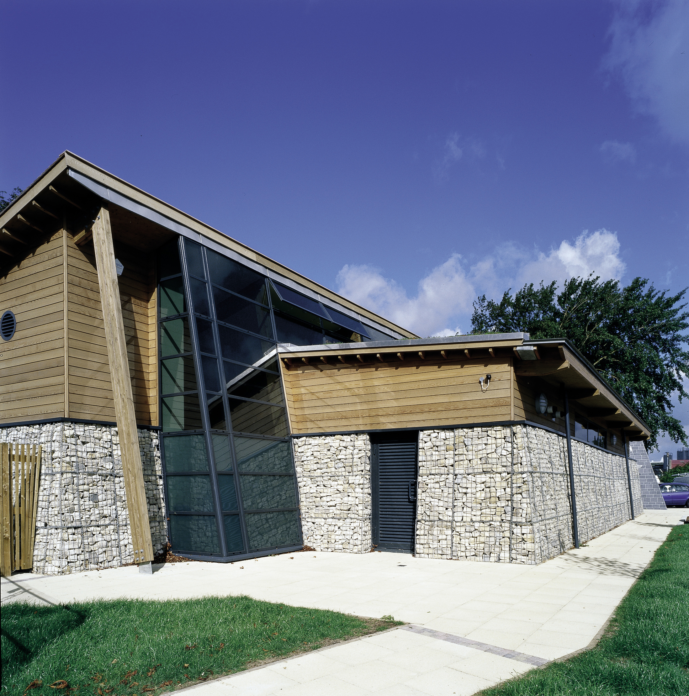 Gabions front the building below cedar boarding and a mainly shingle roof. These gabions, sourced from Portland Stone Quarry, have the functional benefit of inhibiting graffiti and fire-lighting against the building. The rear is timber boarded.