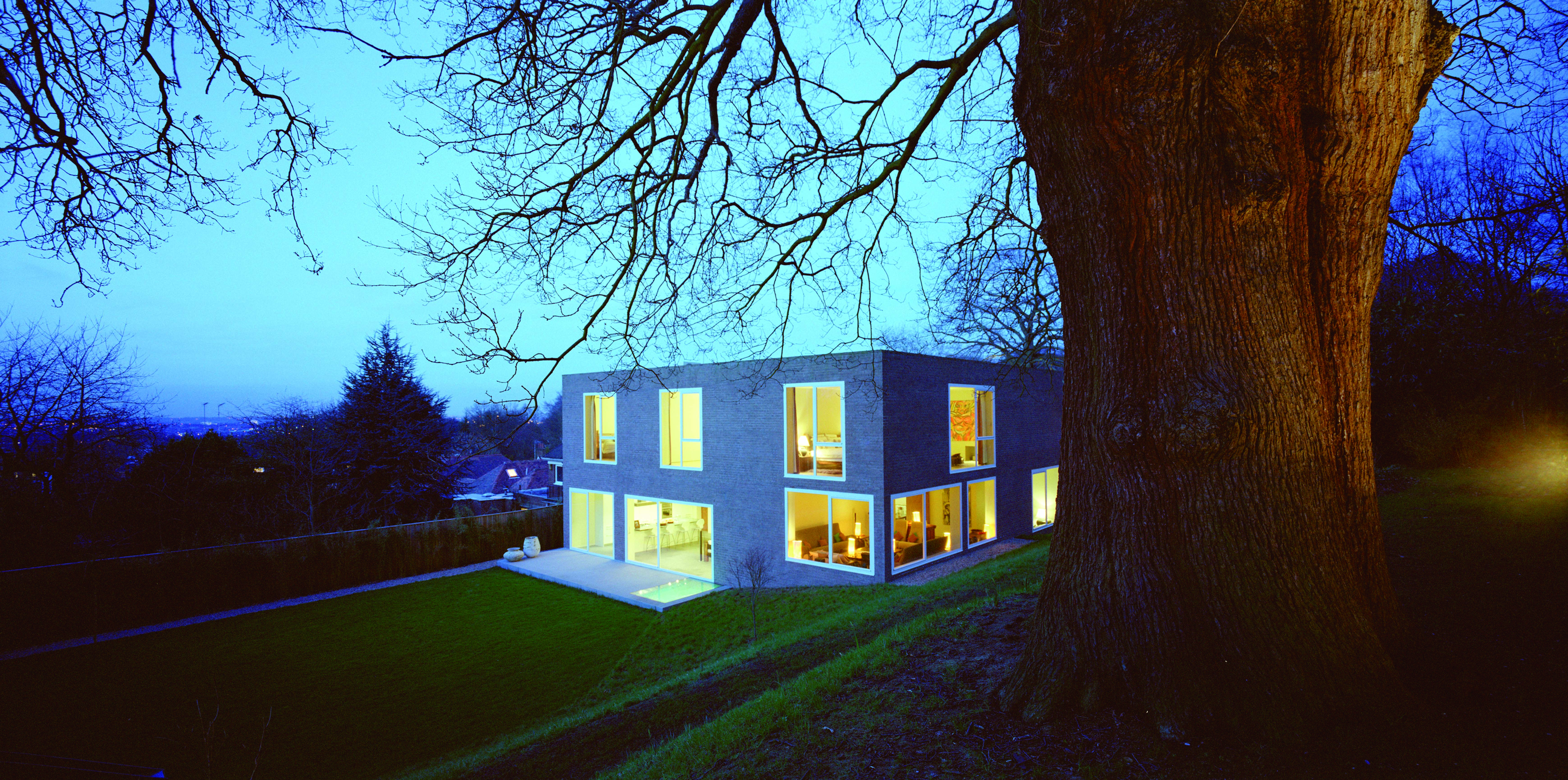 East house from the slope before the heathland starts. The glass panel in the terrace is a rooflight to the pool