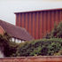 The Courtyard Theatre is 14m high with an envelope of a specially produced Cor-ten A sheet, made to look like sheet piling. Columns are braced and hidden inside the profiled metal and connected to roof trusses which support the roof and carry the lighting grid and access bridges. The external aesthetic of rusting steel is echoed indoors in balustrades of industrial metal, and by internal walls and seat-backs of raw plywood and a general feel of transience in the decor.