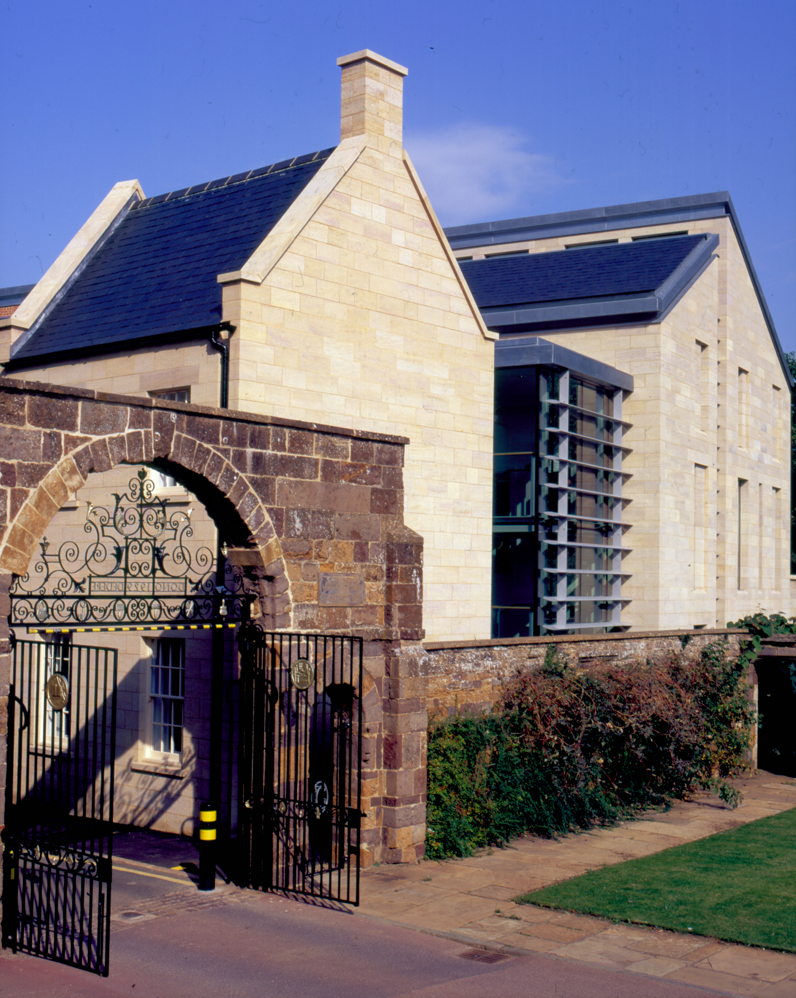 Crisp detailing of the glazed foyer link, the stone facades and the roofs contrasts with the vernacular form