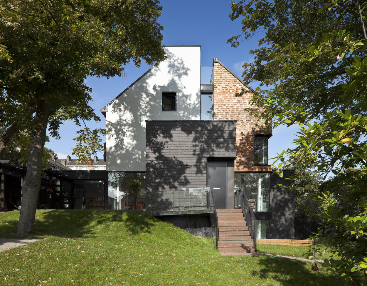 The prominent rear elevation is faced with cedar shingles giving a layered appearance, like the bark of a tree - a house in the woods. The front elevation in contrast relates to the black and white vernacular of surrounding Victorian terraces.