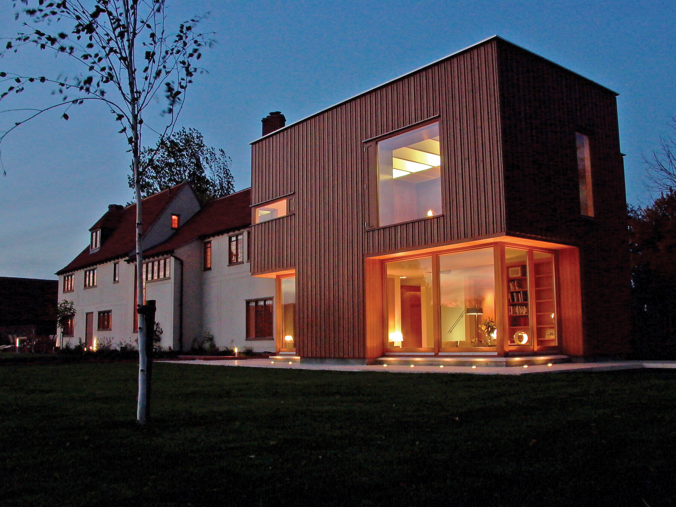 The interior of the former cottages had been reconfigured to form one large house, with kitchen, dining room and music room on the ground floor and bedrooms and bathrooms on the first floor. The new extension, uncompromisingly modern in appearance, provides a library and study on the ground floor, with master bedroom and bathroom upstairs.