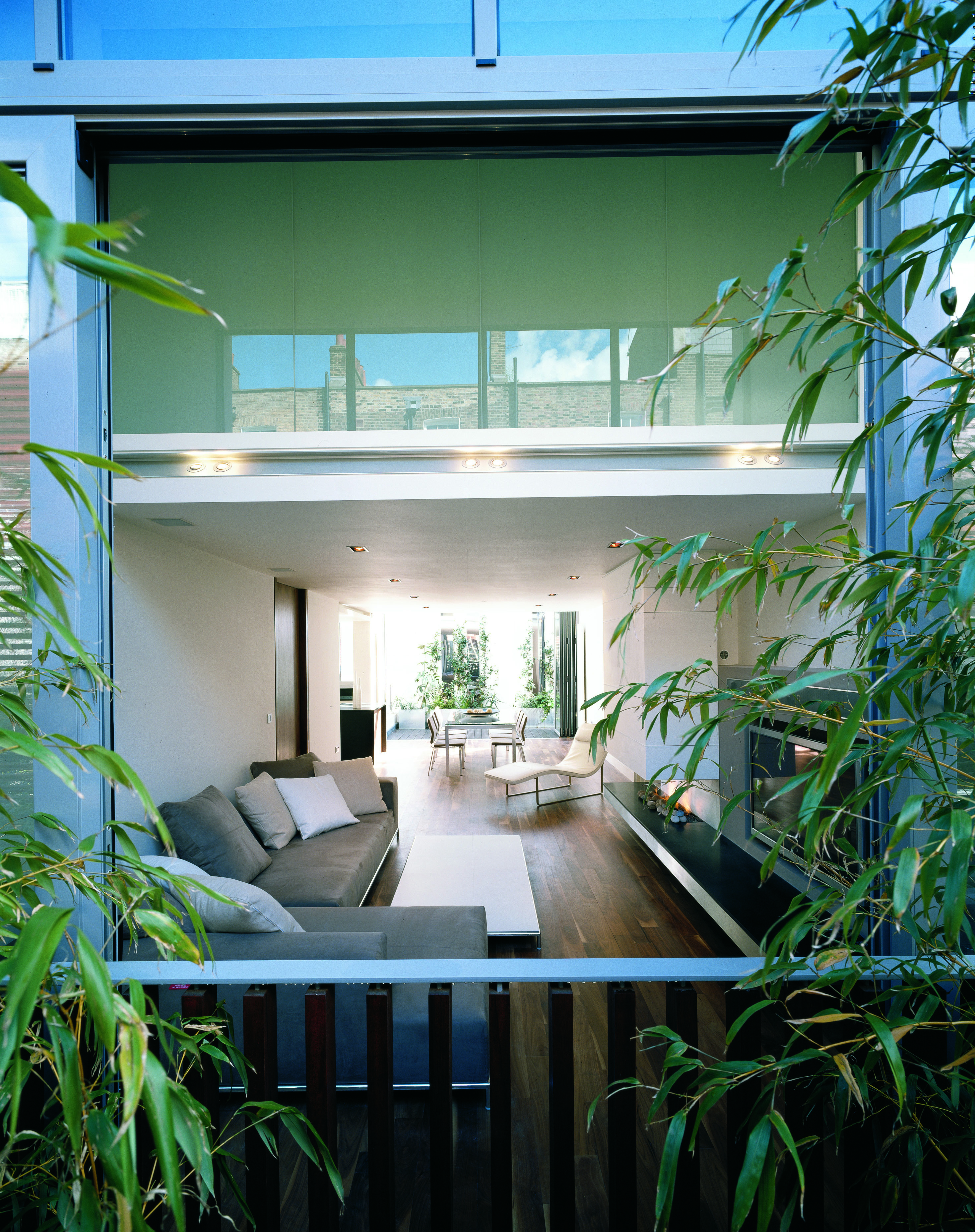 Approaching the houses, a bridge along the front passes over the light slot, providing the semi-basement bedrooms at the front of the building with some privacy screening. Inside, the double- height space provides views to the glass rooflight, through a glass wall to a first floor winter garden opening to the first floor bedroom.