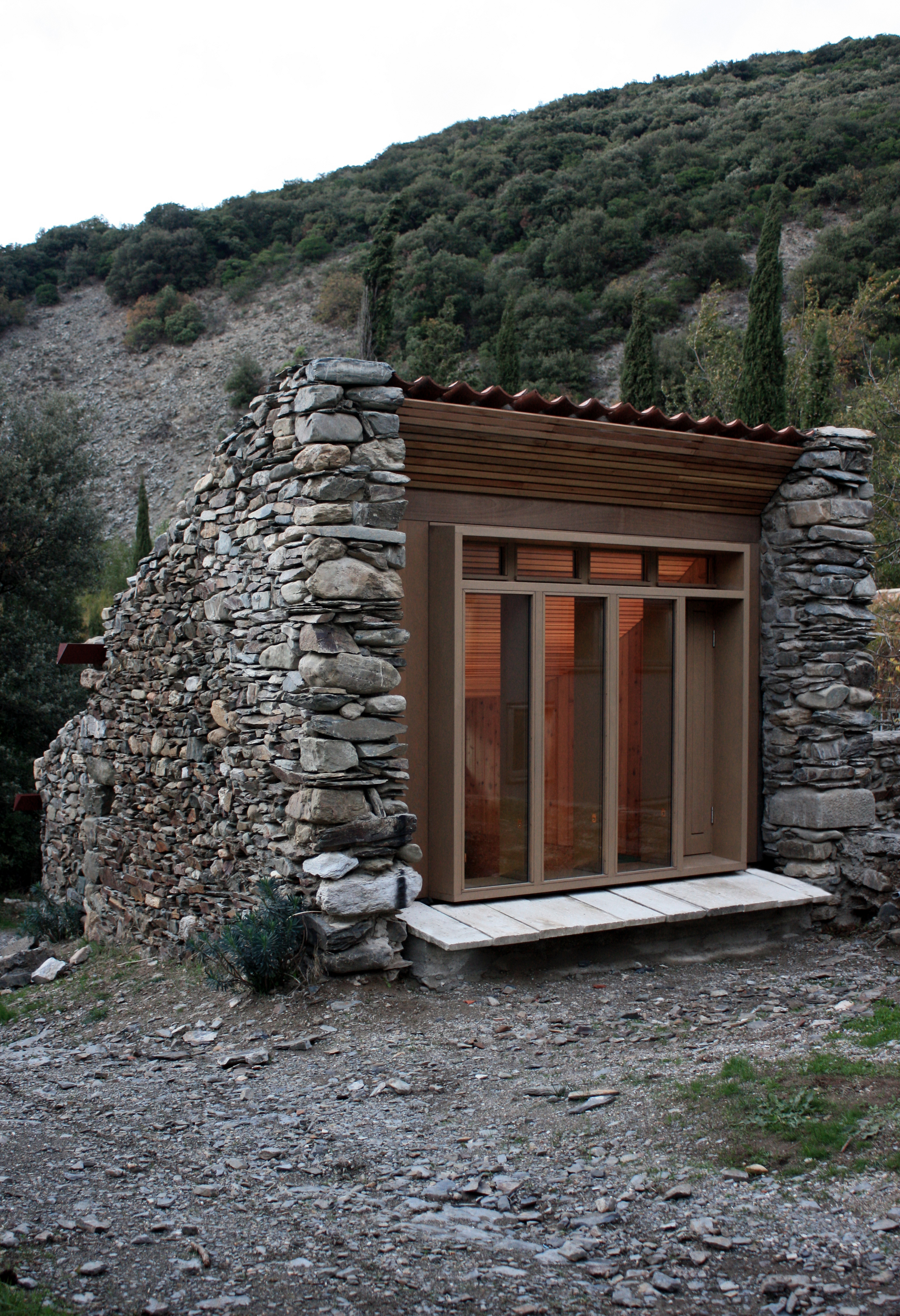 Small self-build hut situated within the outbuildings of a historic water mill in south-west France