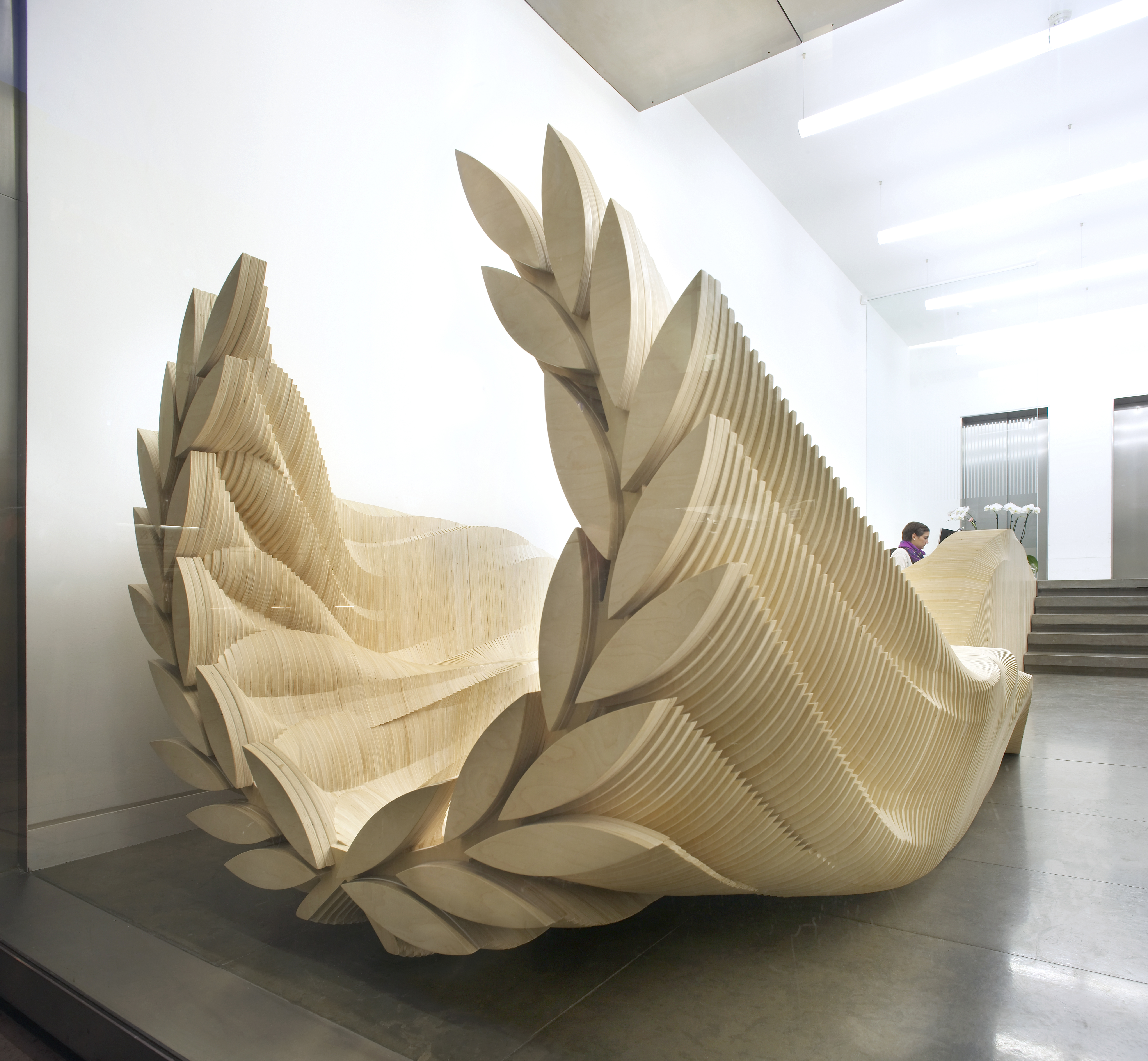 Sculptural piece made from 400 sheets of plywood, forms the reception desk, seating area and signage