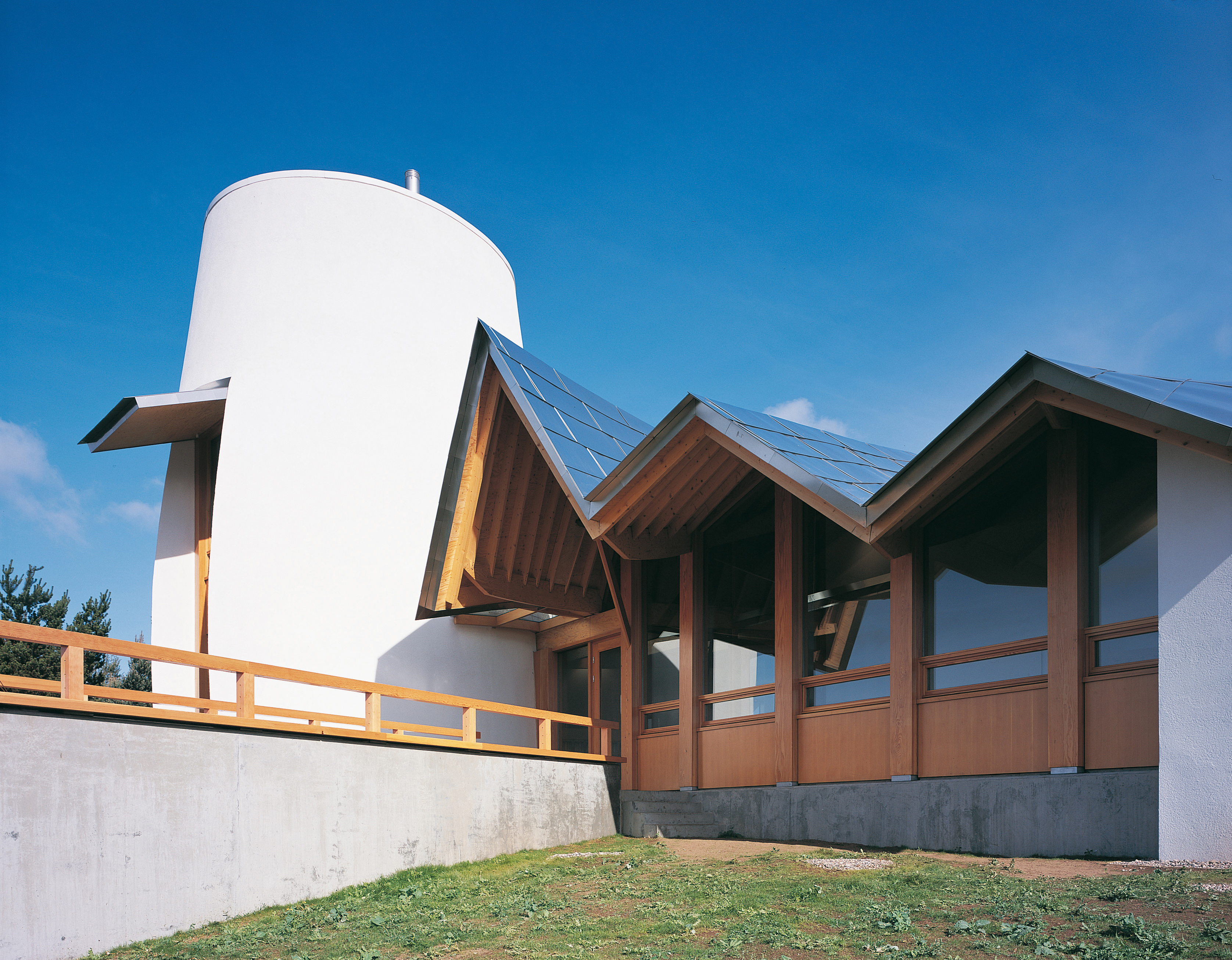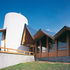 Two-storey white rendered masonry structure with elliptical tower and timber pitched roof at multiple angles, clad in stainless steel