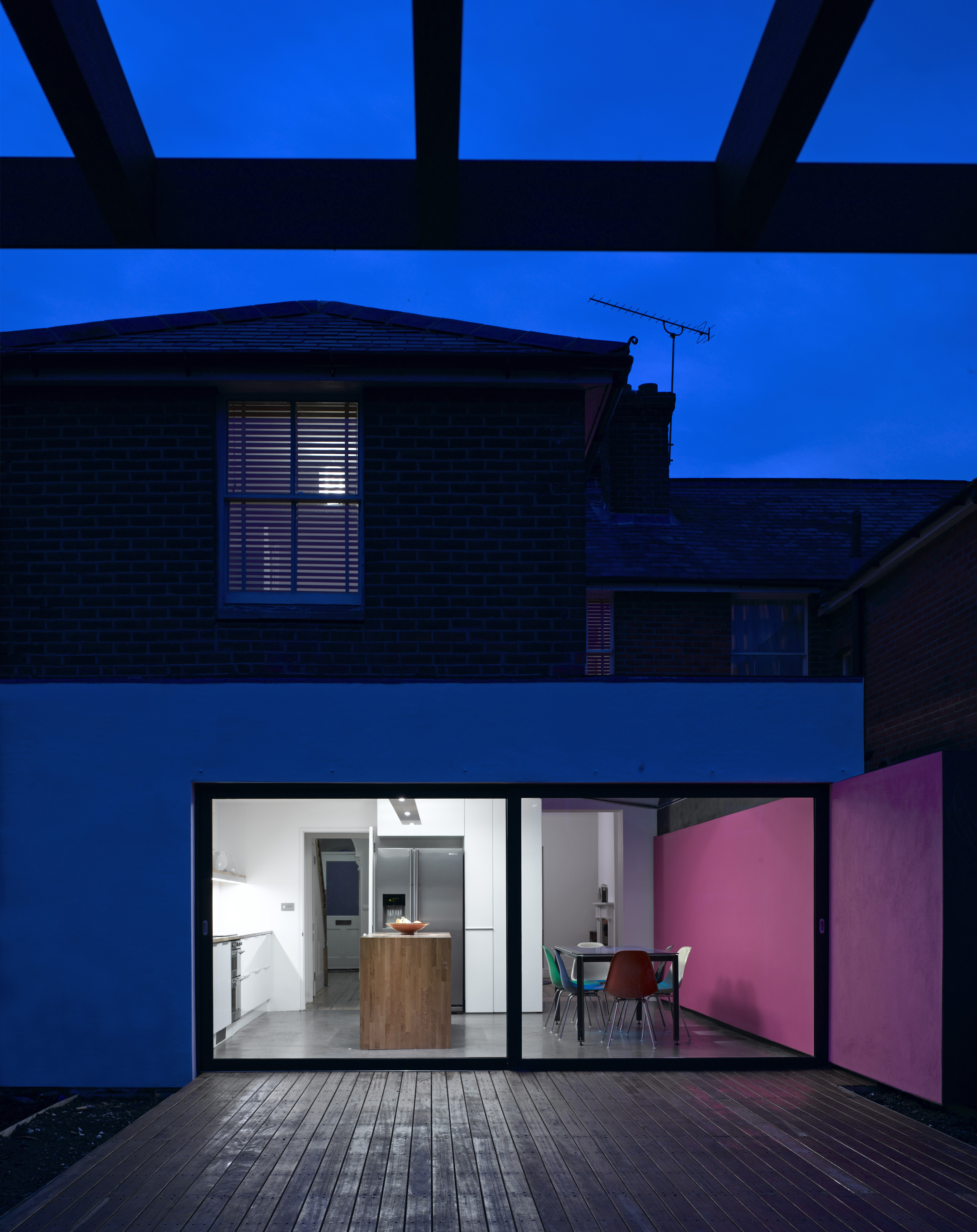 The garden was included as an integral part of the project, and has been treated as an extension of the interior. Various architectural devices were employed to dissolve the internal and external relationship: uninterrupted full-height glazing, aligned floor levels, and a distinctive pink feature wall that extends into the garden.