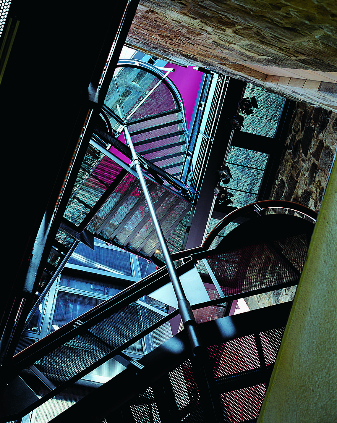 The 'A' Listed existing building has been interfered with as little as possible, so that the elevations to the public streets, and the fine interiors retain their character and can be enjoyed as 'the old Tolbooth'. Special interiors have been reserved for special uses within the existing building, so that the old Courtroom is reused as the pre-eminent performance space, the robing room as a grand bar, and the old council chamber as a high quality restaurant.