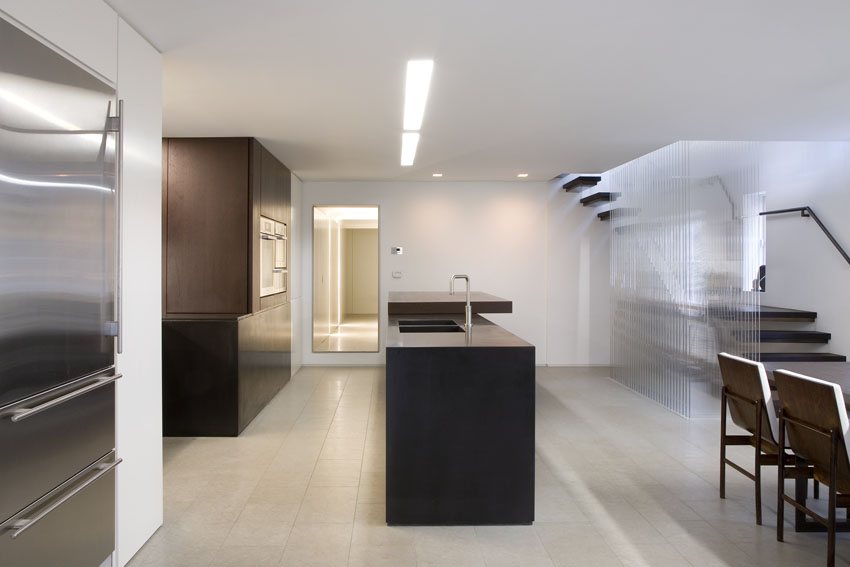 The kitchen cupboards have wenge veneer and spray-lacquered finishes, with precast-concrete panel at low level