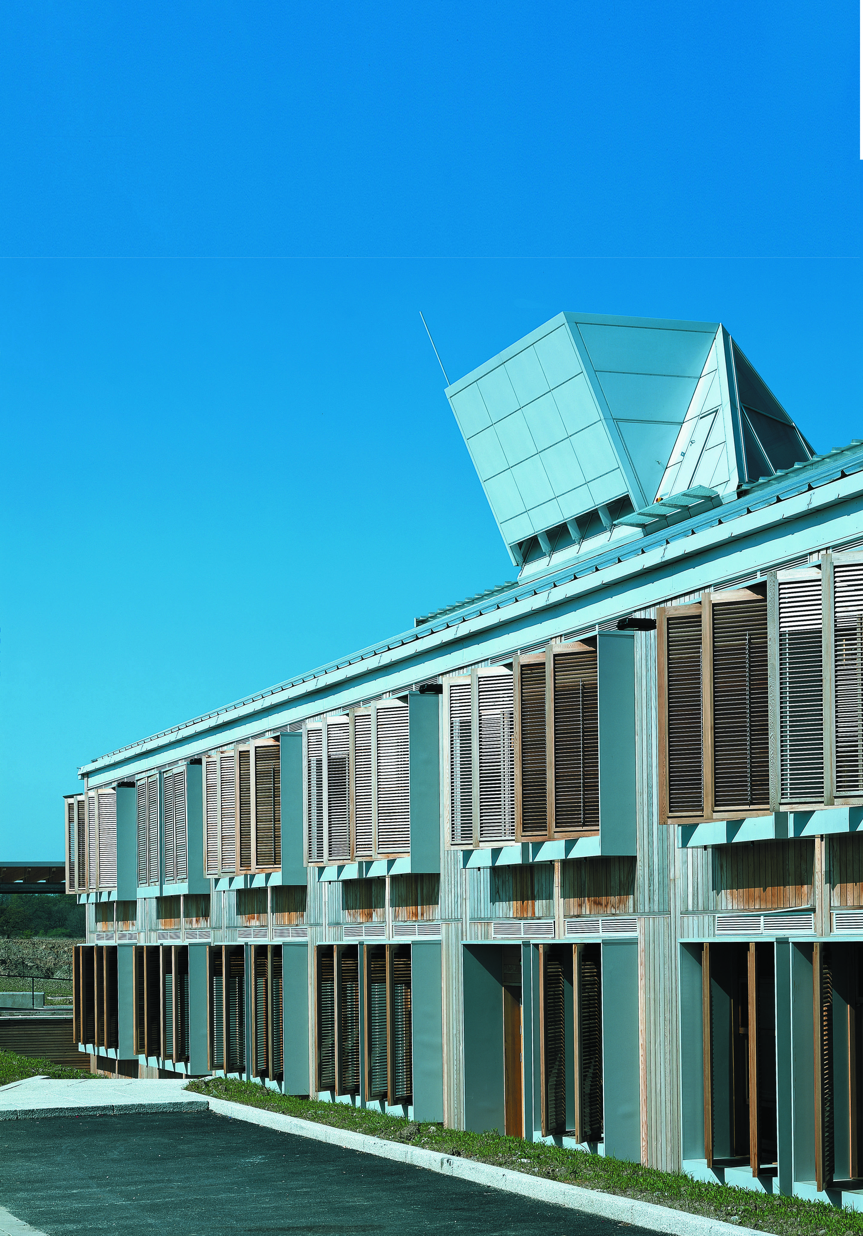 The weathering of the timber cladding melds the building into its landscape. Above the eaves, roof pods are prominently expressed. These distinctive elements define the environmentally responsible and responsive space as a sustainable office building.