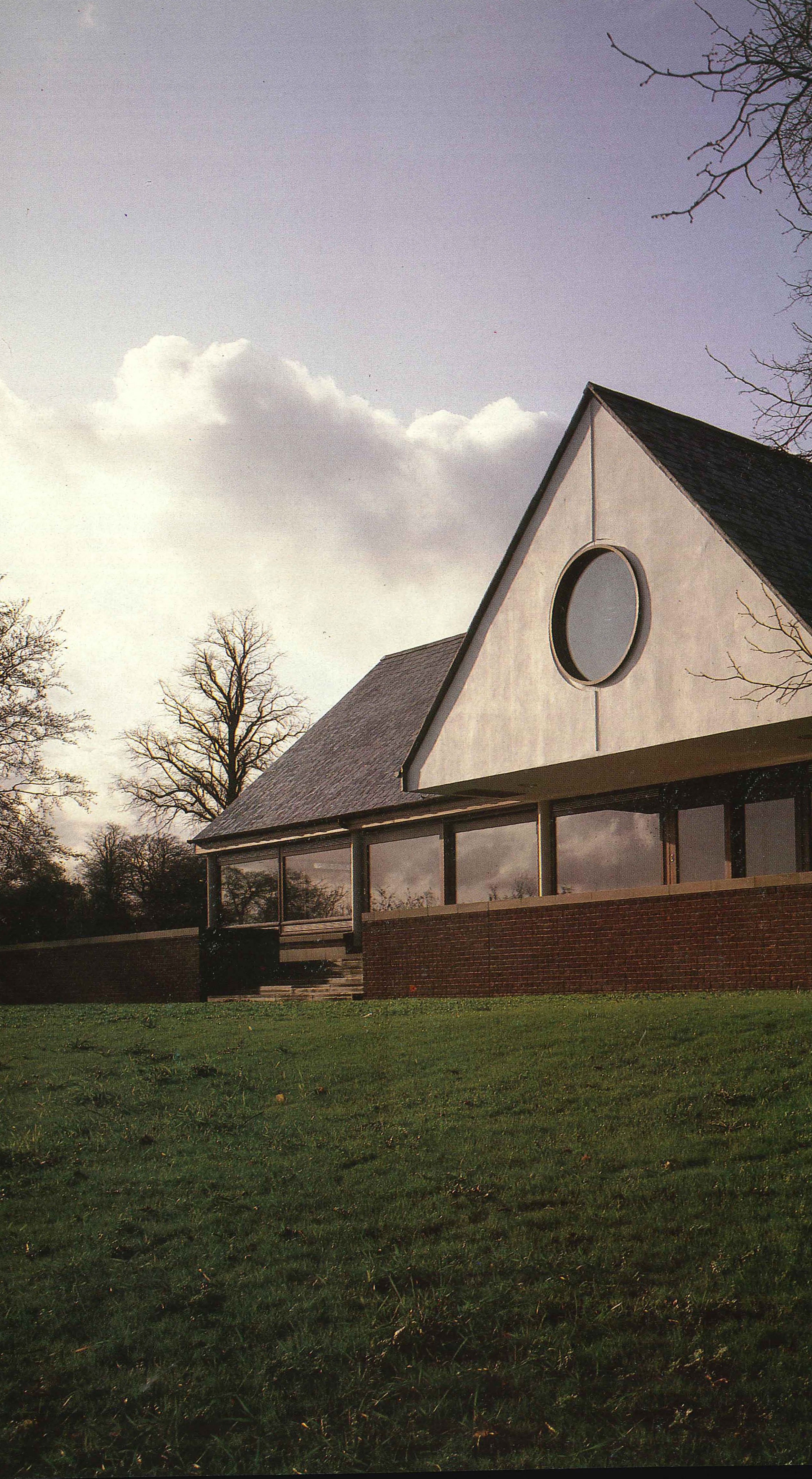 Solid single-storey building with a high 45 degree pitched roof; contrasting with a generous amount of the ground floor glazing