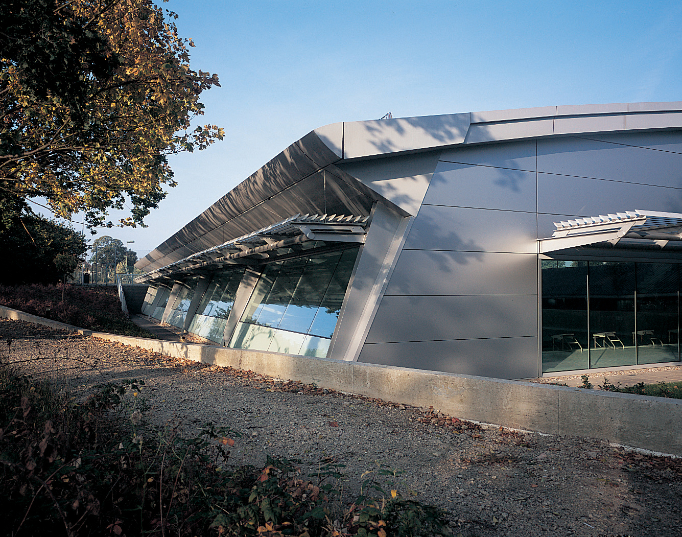 The building is formed by an arched, standing-seam roofed enclosure, with a low roof sweep carefully designed to avoid any roof penetrations.