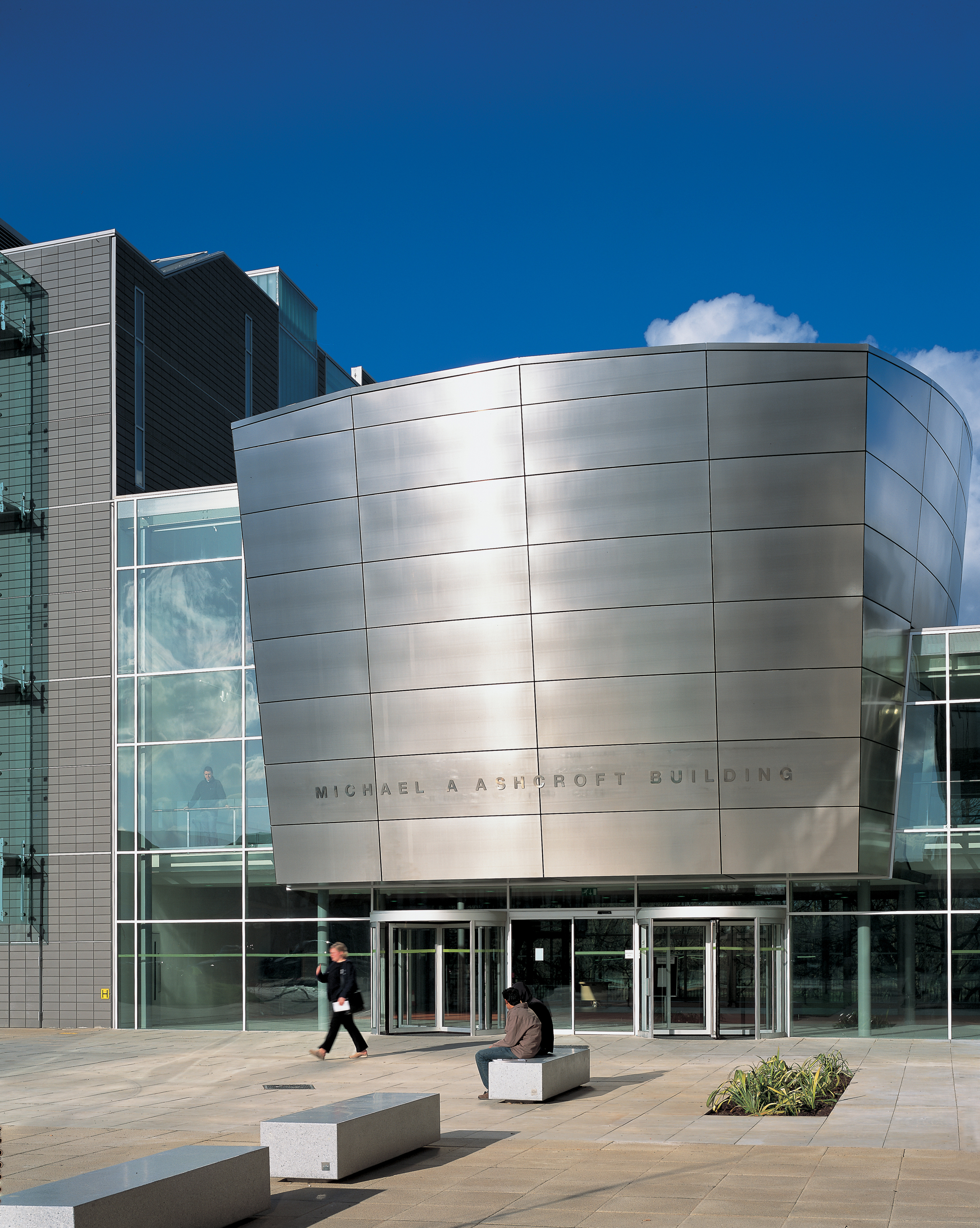 The Ashcroft business school has a totally glazed, bio-climatic southerly double-layer facade and stepped-plan. The largely-glazed wall to the north take advantage of the best views and is set between bookends of staircases and risers clad in grey terracotta rainscreen.