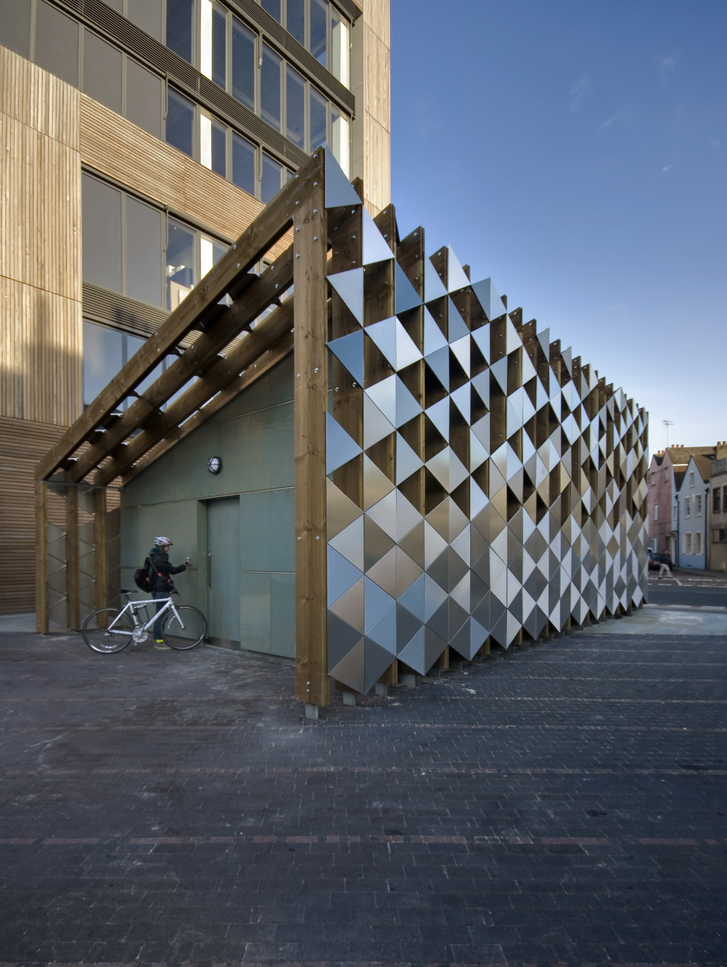 The landscape proposal for the area (by East) was conceived as a carpet on which an array of jewels are scattered – benches, bollards, cycle hoops and a petanque pitch. The bike store’s triangular stainless-steel cladding panels are based on the geometry of the unravelled, gem-like bollards from the external landscaping.