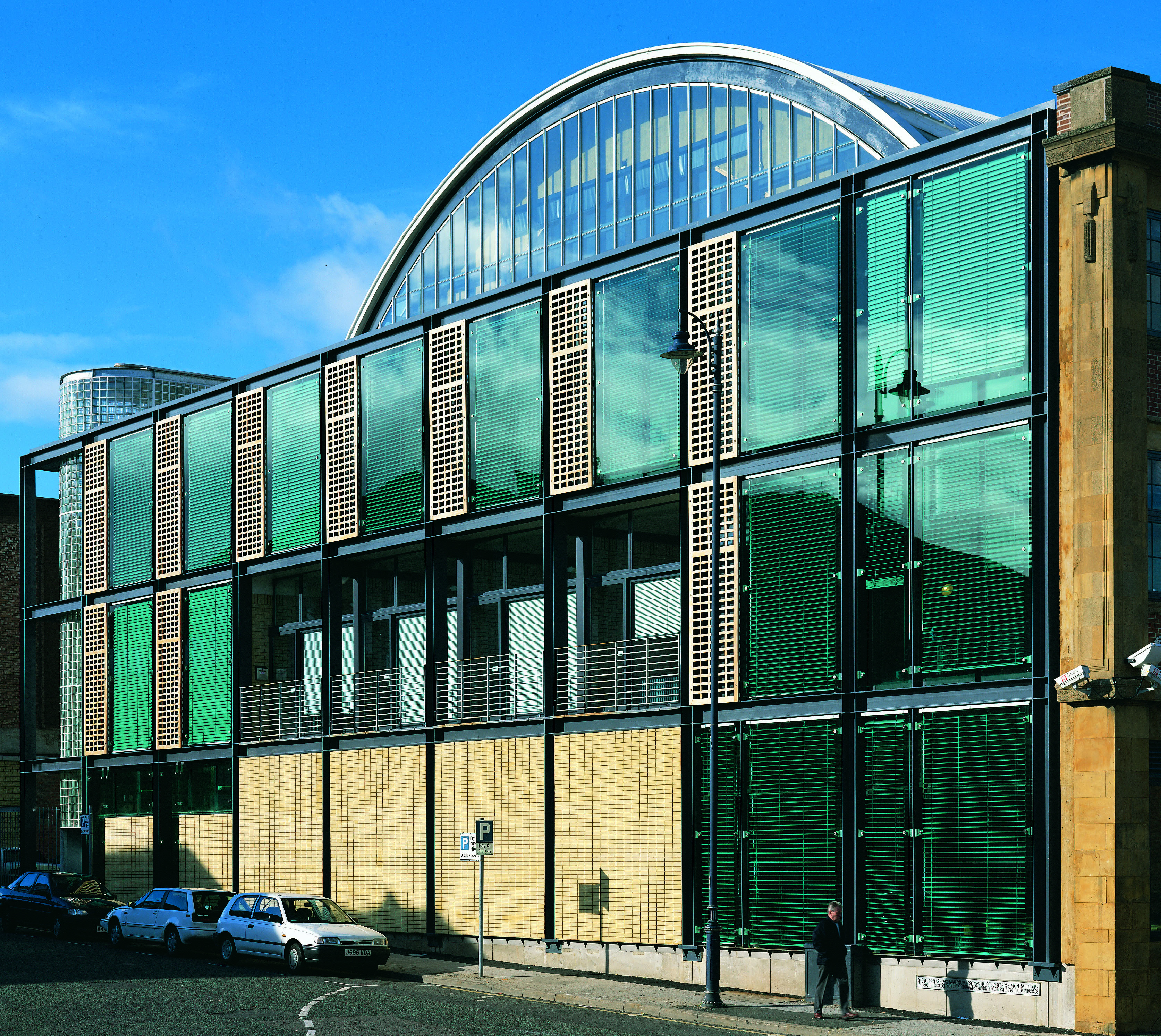Independent offices are provided for the Birmingham Contemporary Music Group. The multi-layer south glazed elevation allows useful passive solar gains, controlled with natural ventilation and adjustable screening.