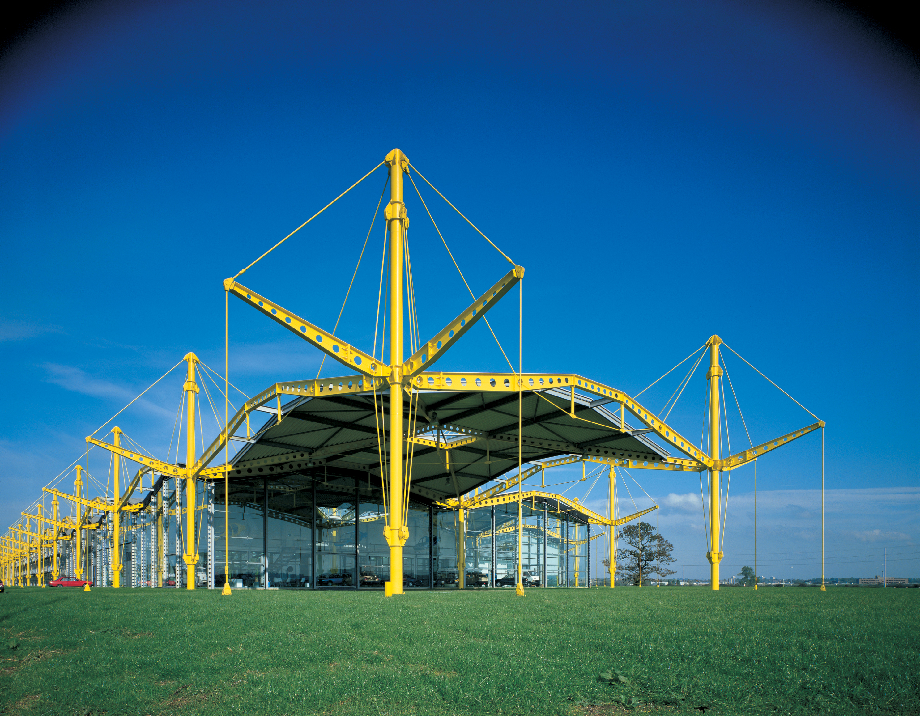 The centre was commissioned as Renault's main UK distribution facility. In addition to warehousing, it includes a showroom, training school, workshops, offices and a staff restaurant. The floor area of 25,000m2 is housed within a single enclosure supported by brightly coloured tubular masts and arched steel beams, forming a silhouette within its surrounding landscape.