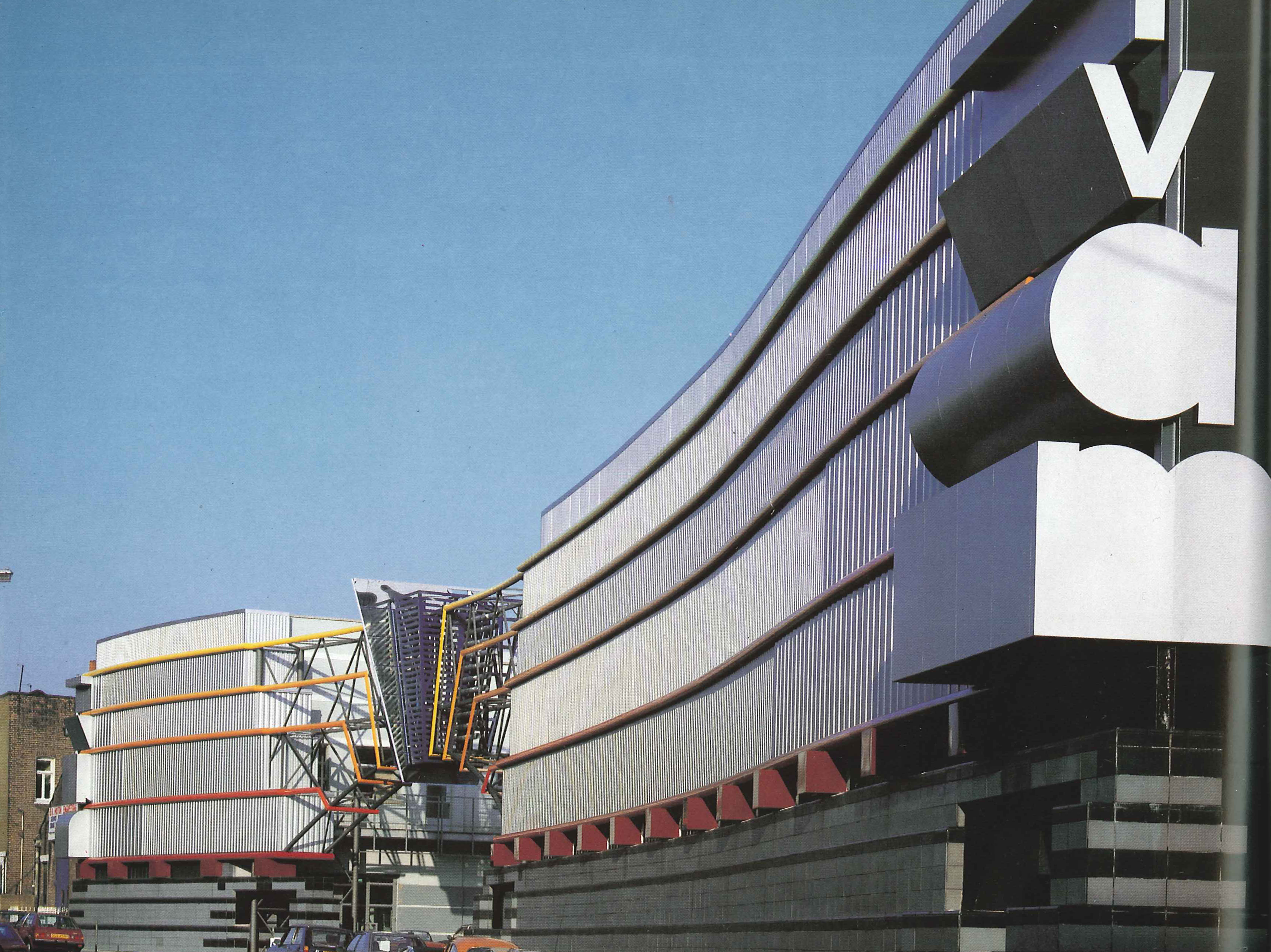 The studio replaces a disused 1950’s garage and makes use of an existing 1920’s warehouse on a site between a canal and one-way street. The curved street façade, clad in black and grey ceramic-faced concrete blockwork, is terminated at each end by large T, V, a, m letters protruding from the wall announcing the building. A Skeletal arch with coloured banding supports a mutilated keystone over the entrance to the forecourt.