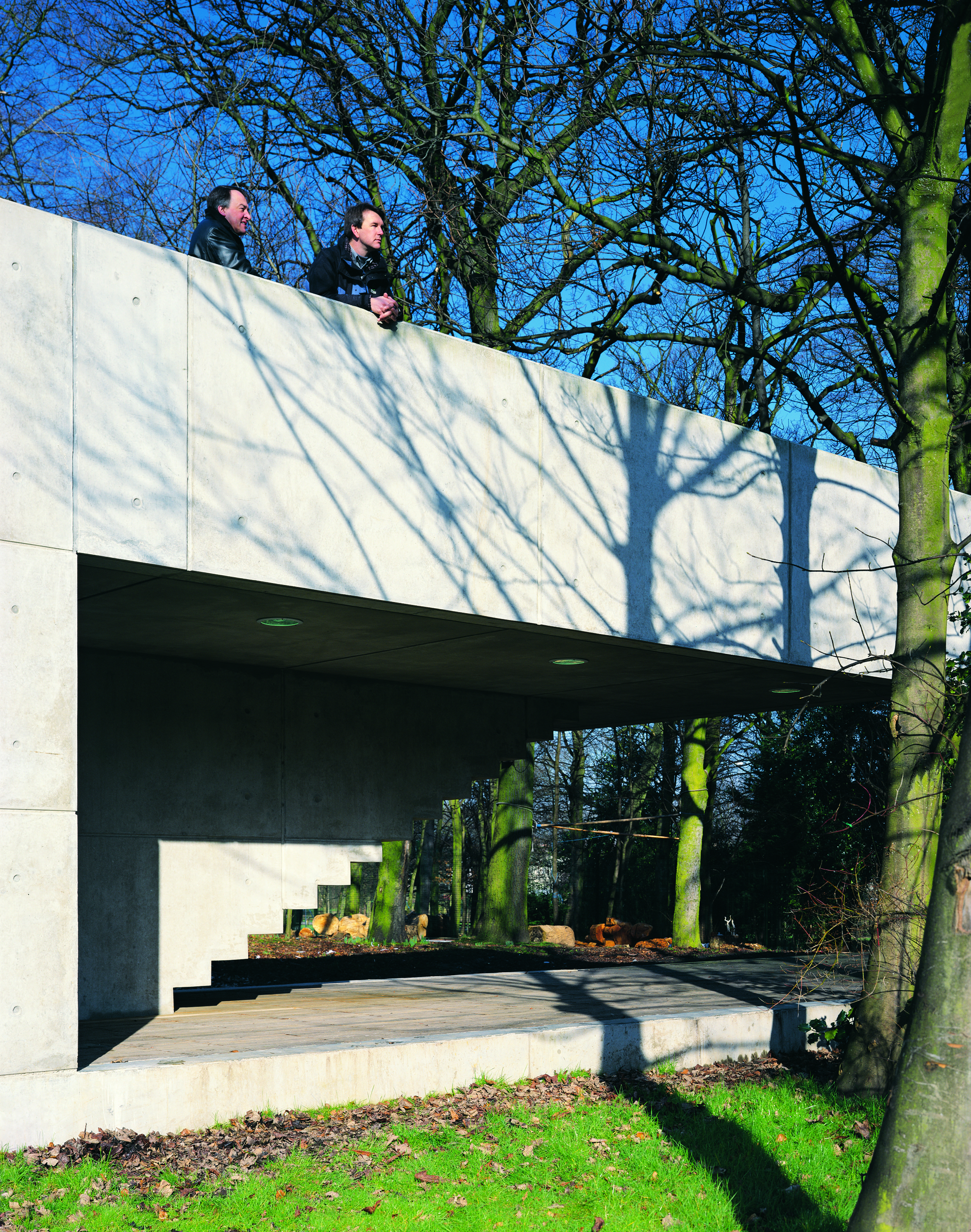 At the east end the concrete wall is wholly permeable and lined with oak to define covered education areas. Upon entering, this palette is inverted with adjustable oak shutters cloaking an internal skin of concrete to the café bar and offices located at the west end.