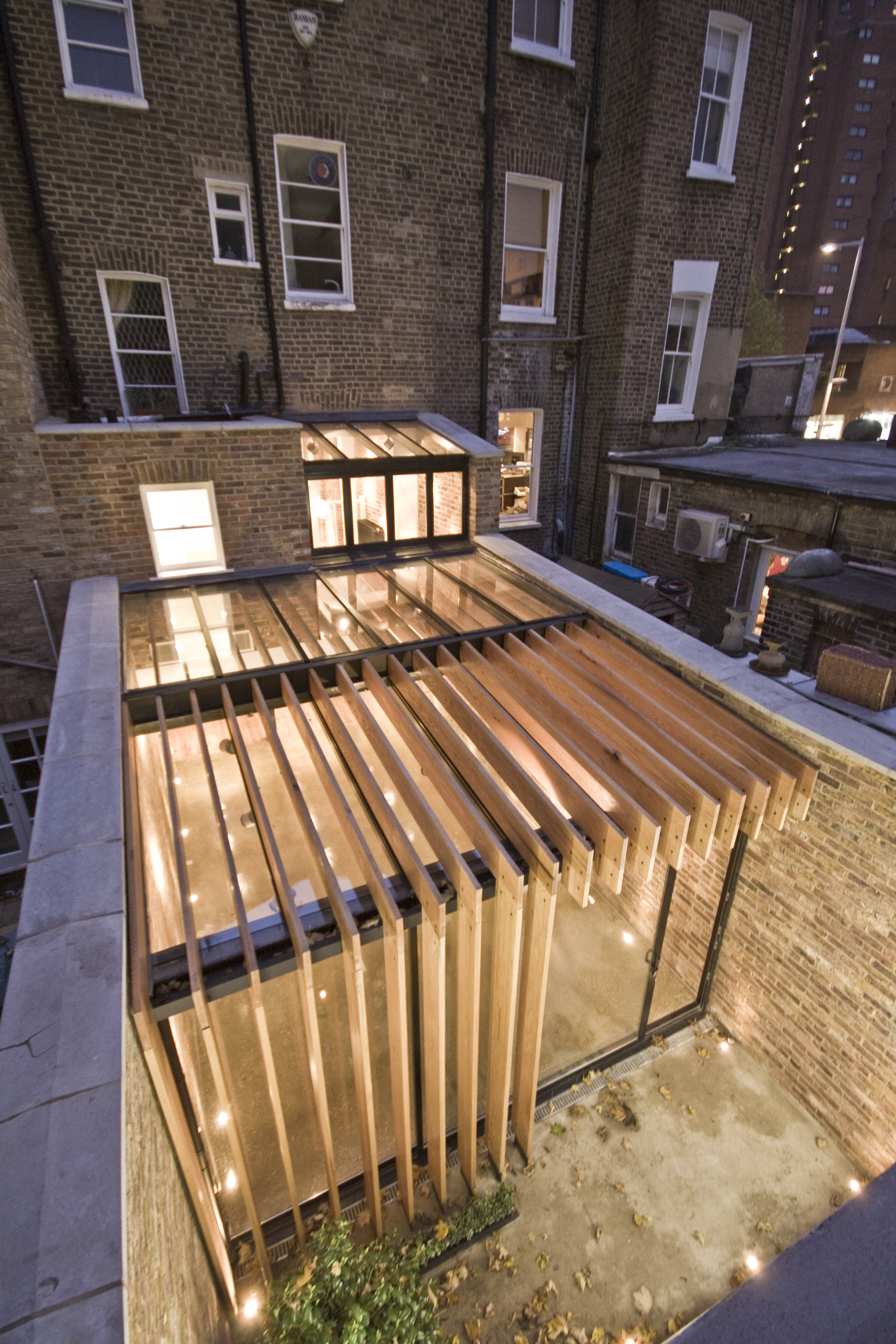 Old layers of plaster and MDF were stripped back exposing the original structure of the terraced property. This space is opened up with glazed extension, enclosing the courtyard creating a light gallery space