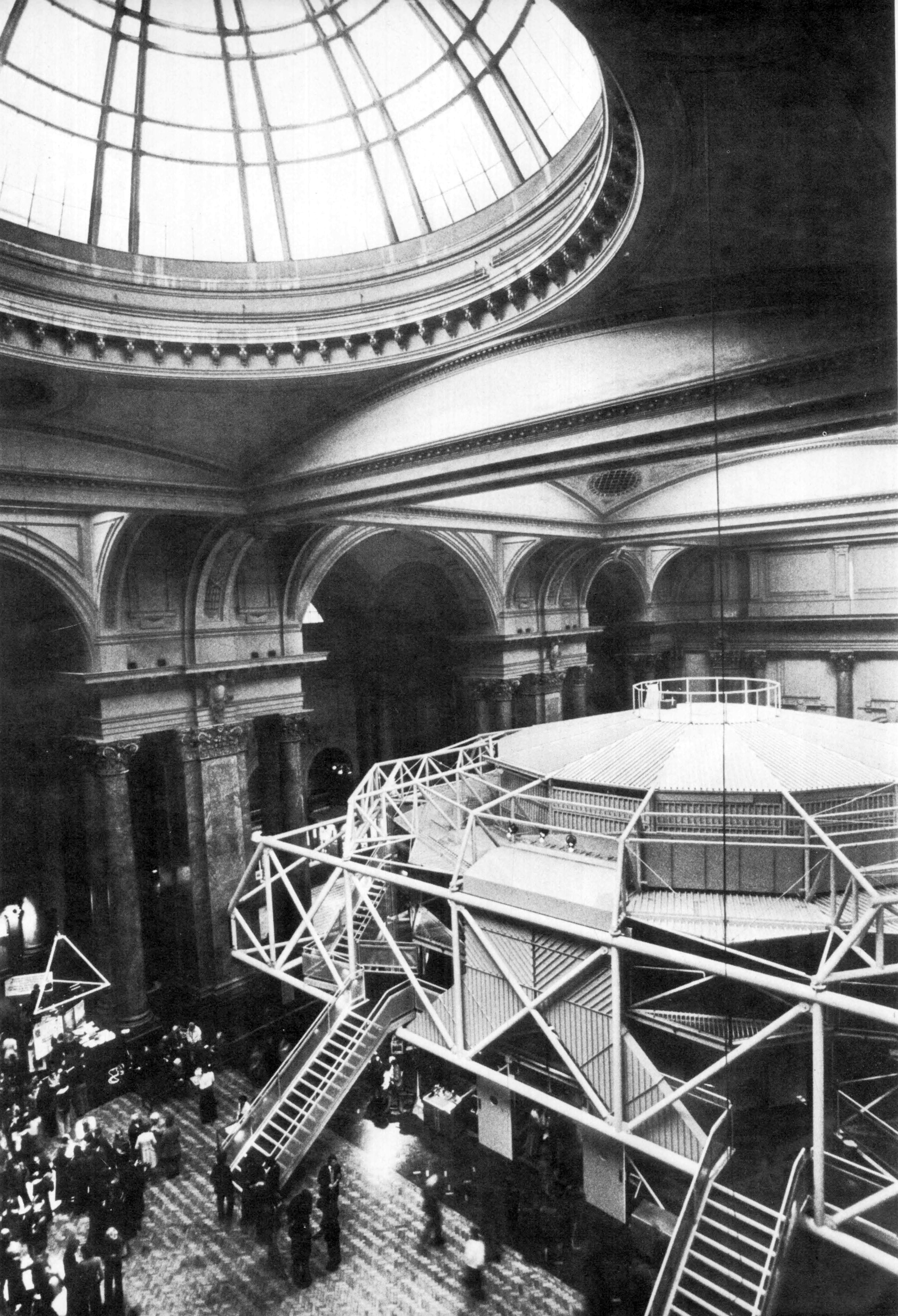 The great hall of the Exchange acts as a foyer to the 'theatre module' which site under the central dome