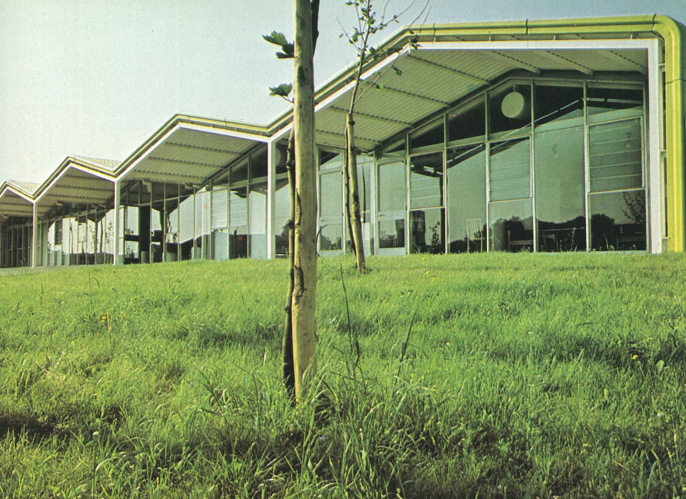 The school sits in its field like a luminous, five-gabled farm building