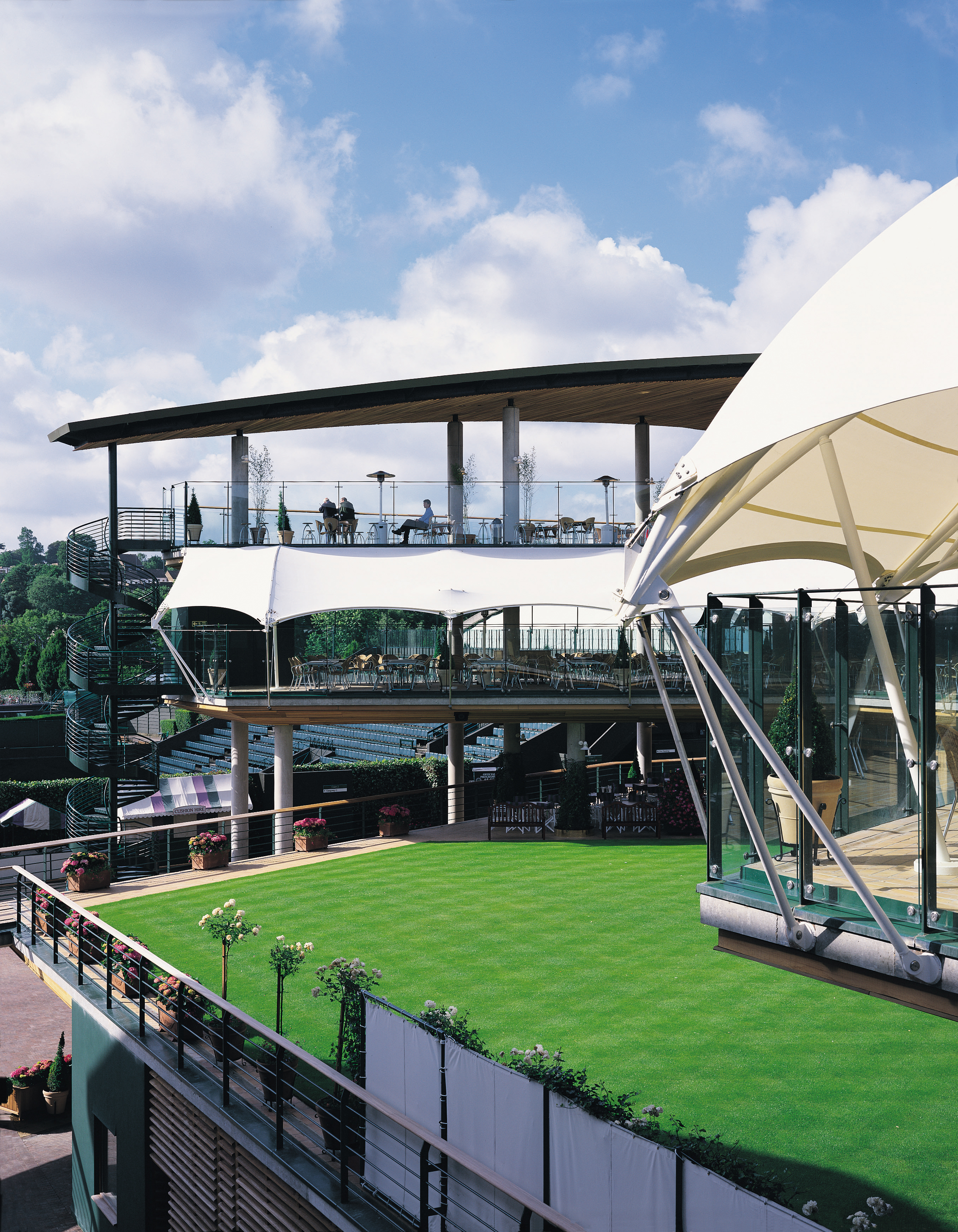Materials throughout include Iroko wood, glass, fabric awnings and a timber soffit to the curved roof of colour-coated green standing seam aluminium, to relate to Centre Court and the new No 1 Court.