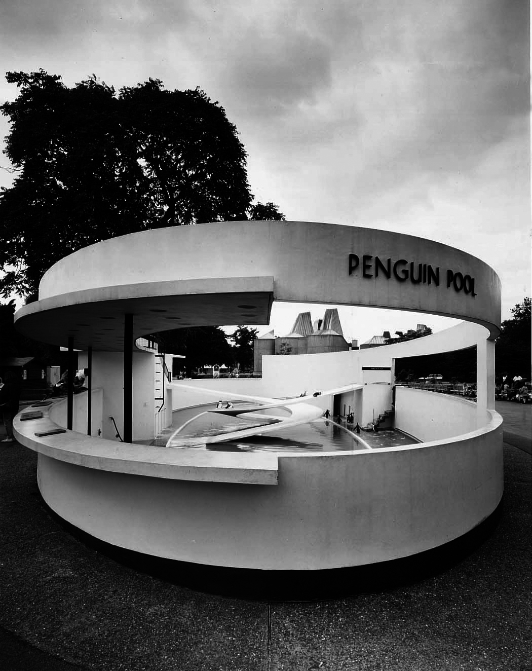 Elliptical shaped penguin pool built in reinforced concrete incorporating swimming pool, diving tank, spiral ramps and nesting boxes