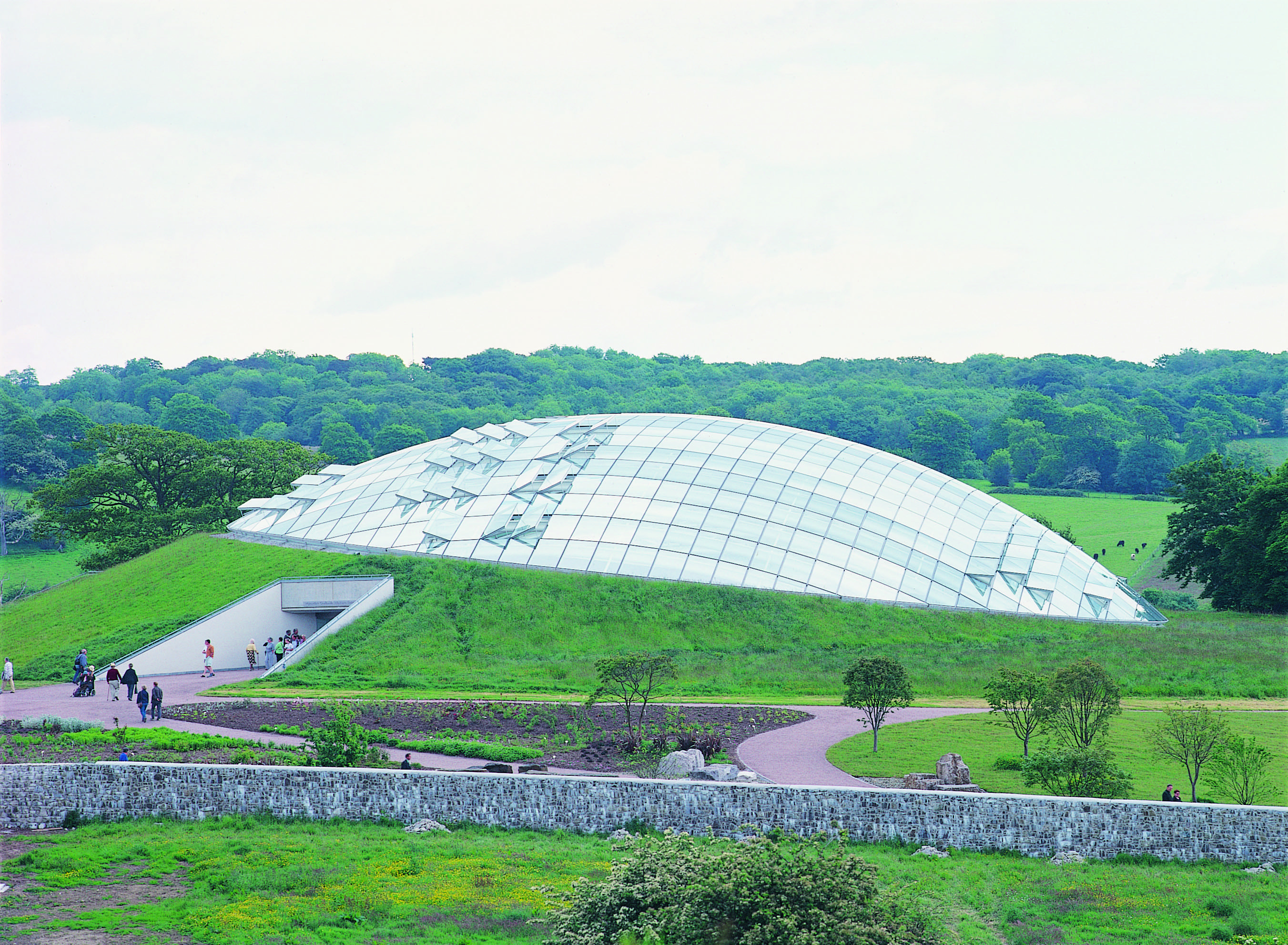 The site sits at the top of a gentle hill, slightly off-axis with the long approach path leading up from the car park and visitors’ entrance – a circular timber ‘gatehouse’ based on the shape of an ancient Welsh roundhouse, also designed by Foster + Partners.