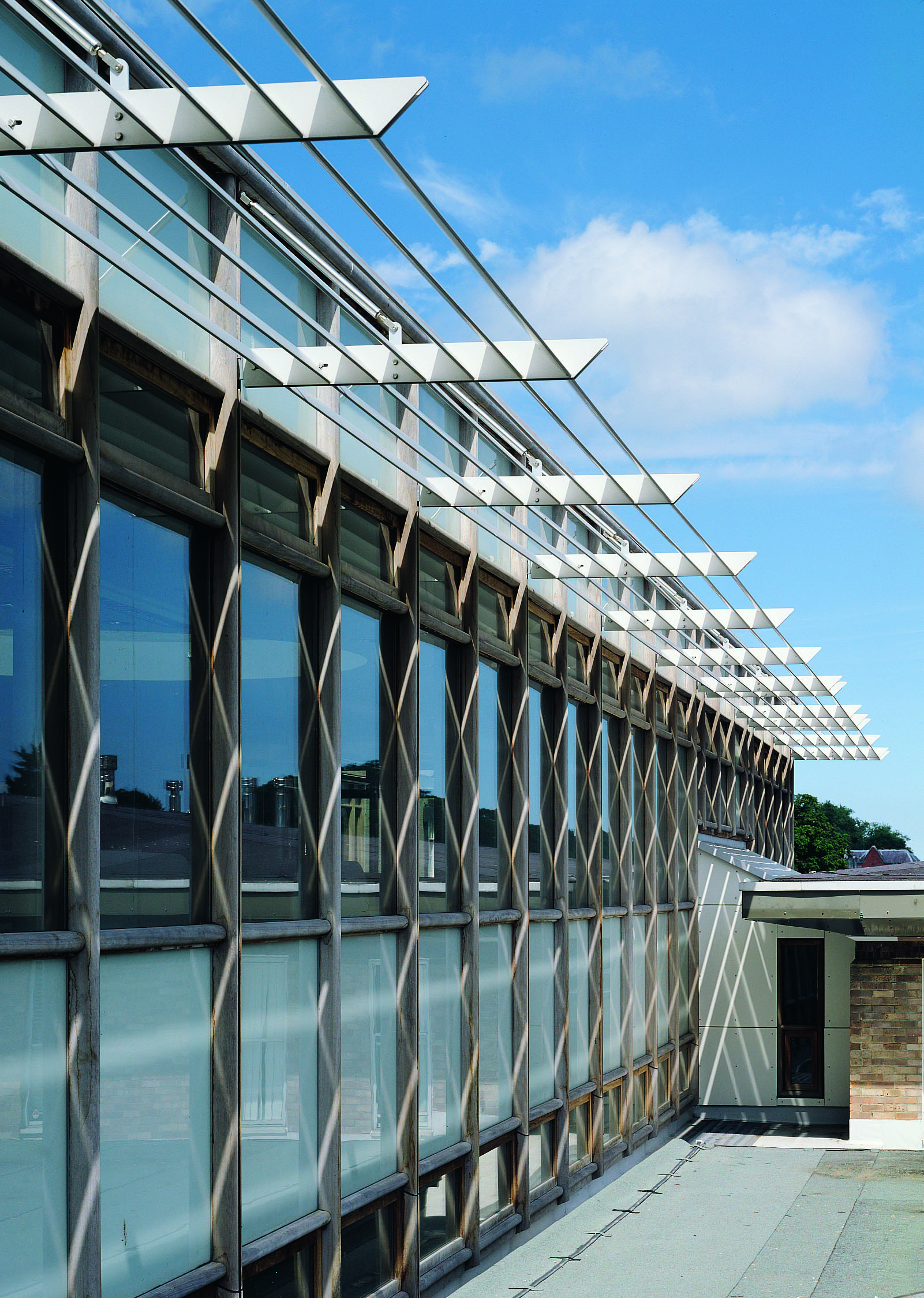 Externally the link building of the information services building is extensively glazed with framing of hardwood and shading louvres