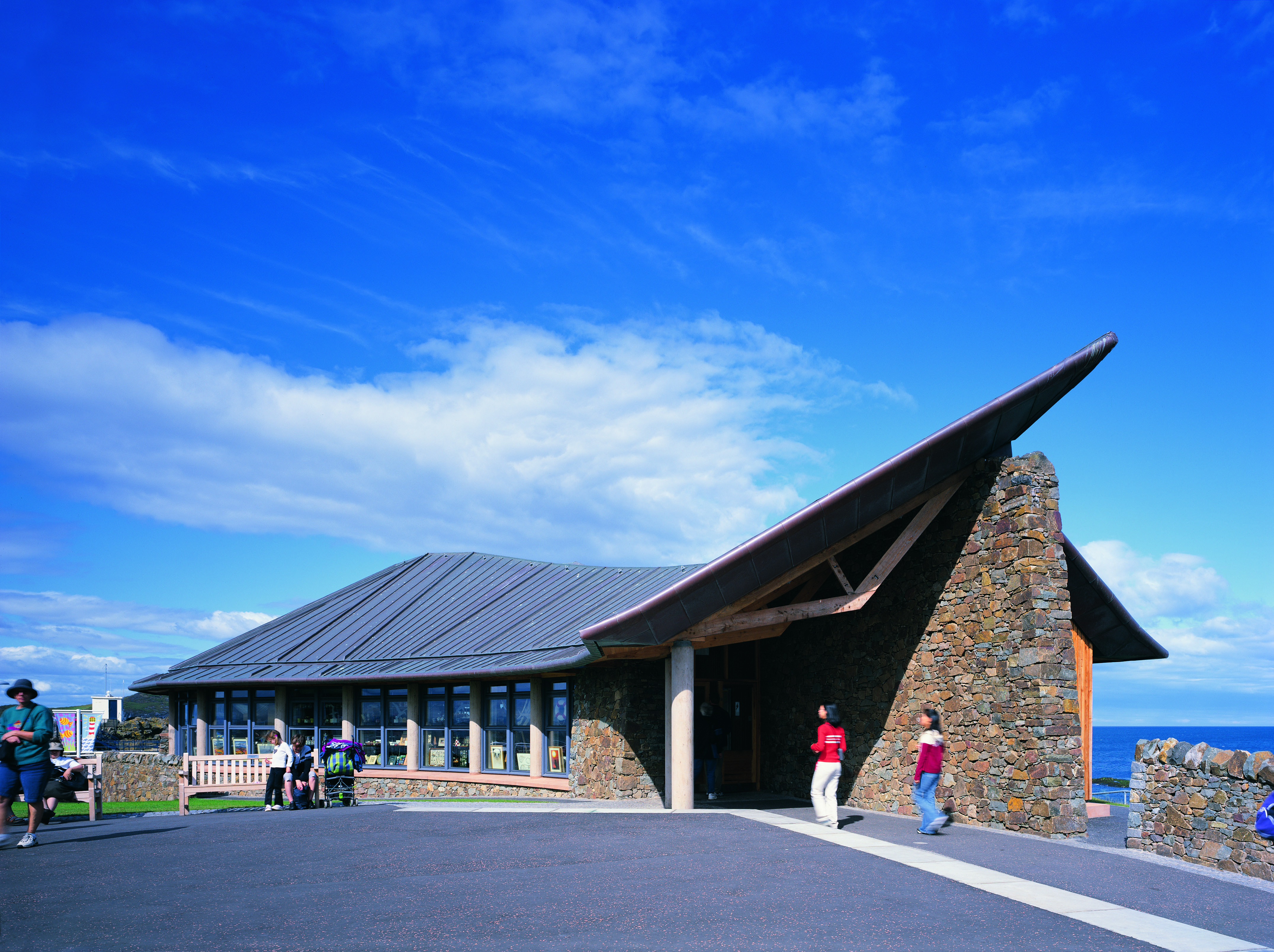 The new building is robustly built with a dry stone weather screen, rough sawn larch boarding and a copper roof supported on solid, larch trusses. Its unusual shape reflects the panoramic views of all the islands and the need for a welcoming entrance to draw people into this landmark building.