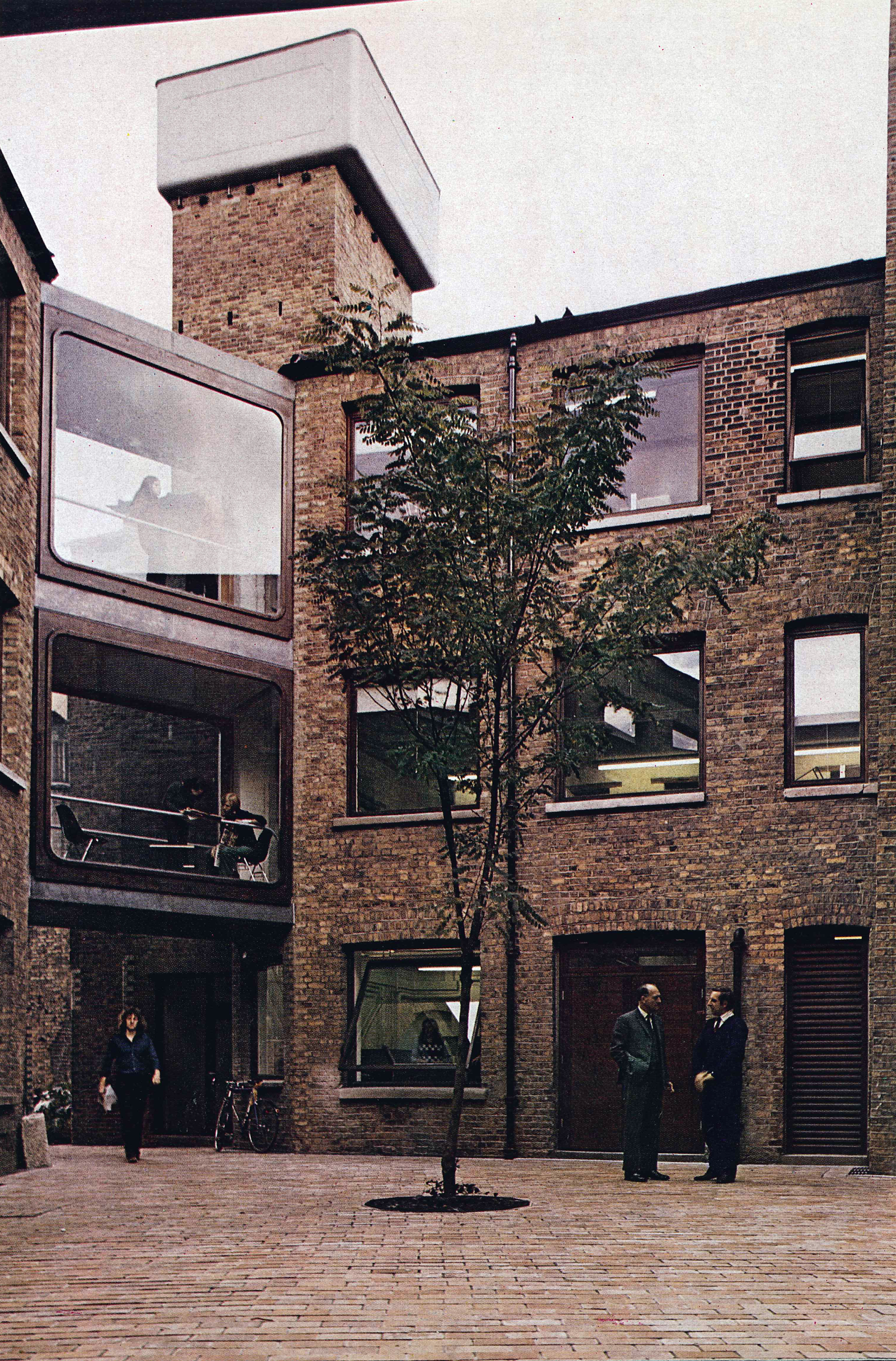 A new glazed entrance and reception area has replaced a old brick structure and leads directly to conference rooms, lavatories and the main staircase. The wings on either side house administration offices, library, plant and print room. The two upper floors contain a mix of partners flats, drawing offices and work stations.