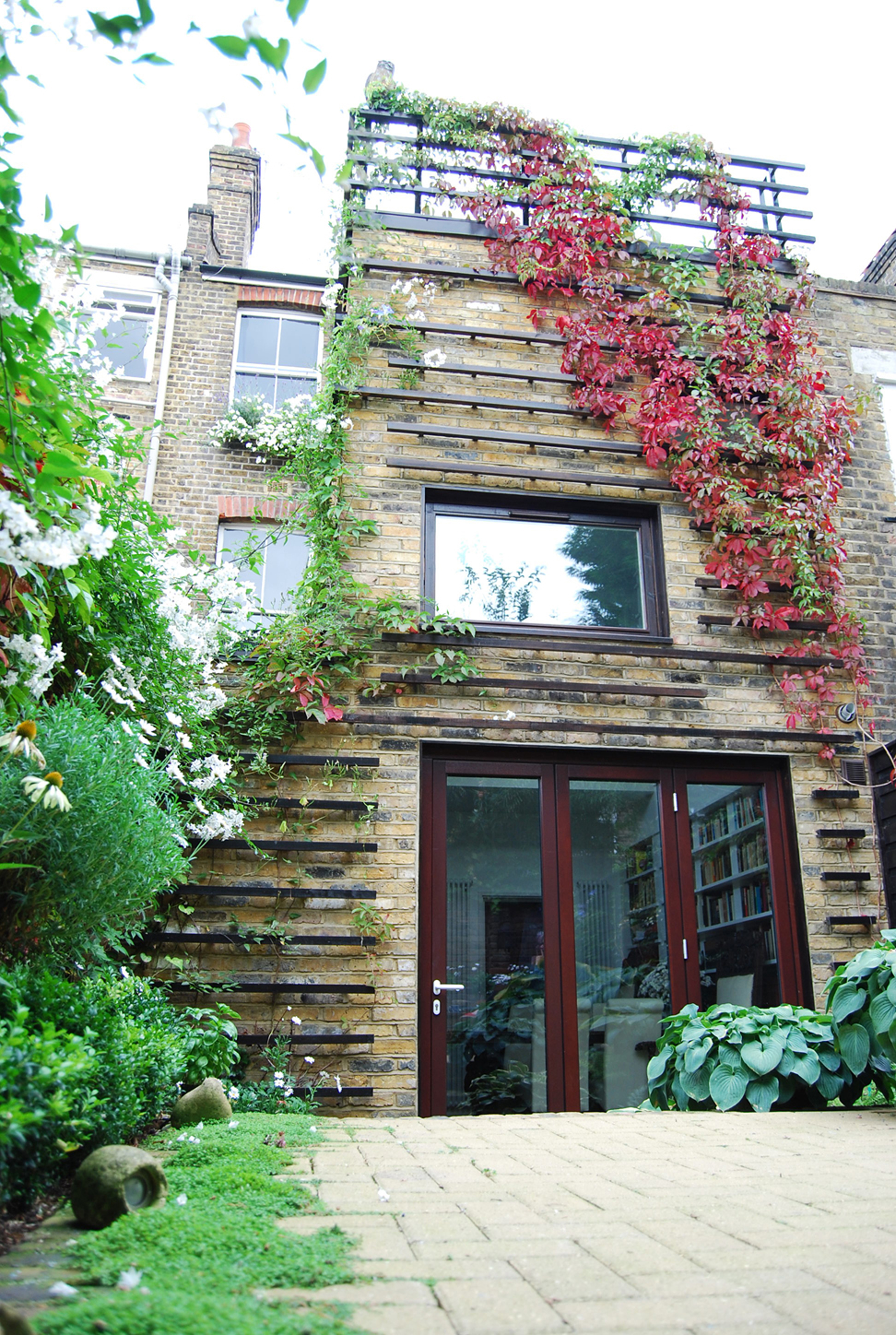 Bookcases furnish the garden room, which looks out onto a garden that is now on two levels, greatly increasing the density of planting that one sees from inside. In addition, the building itself has been turned into a ‘vertical garden’, with strongly articulated horizontal trellis bars up which climbing plants will scramble.