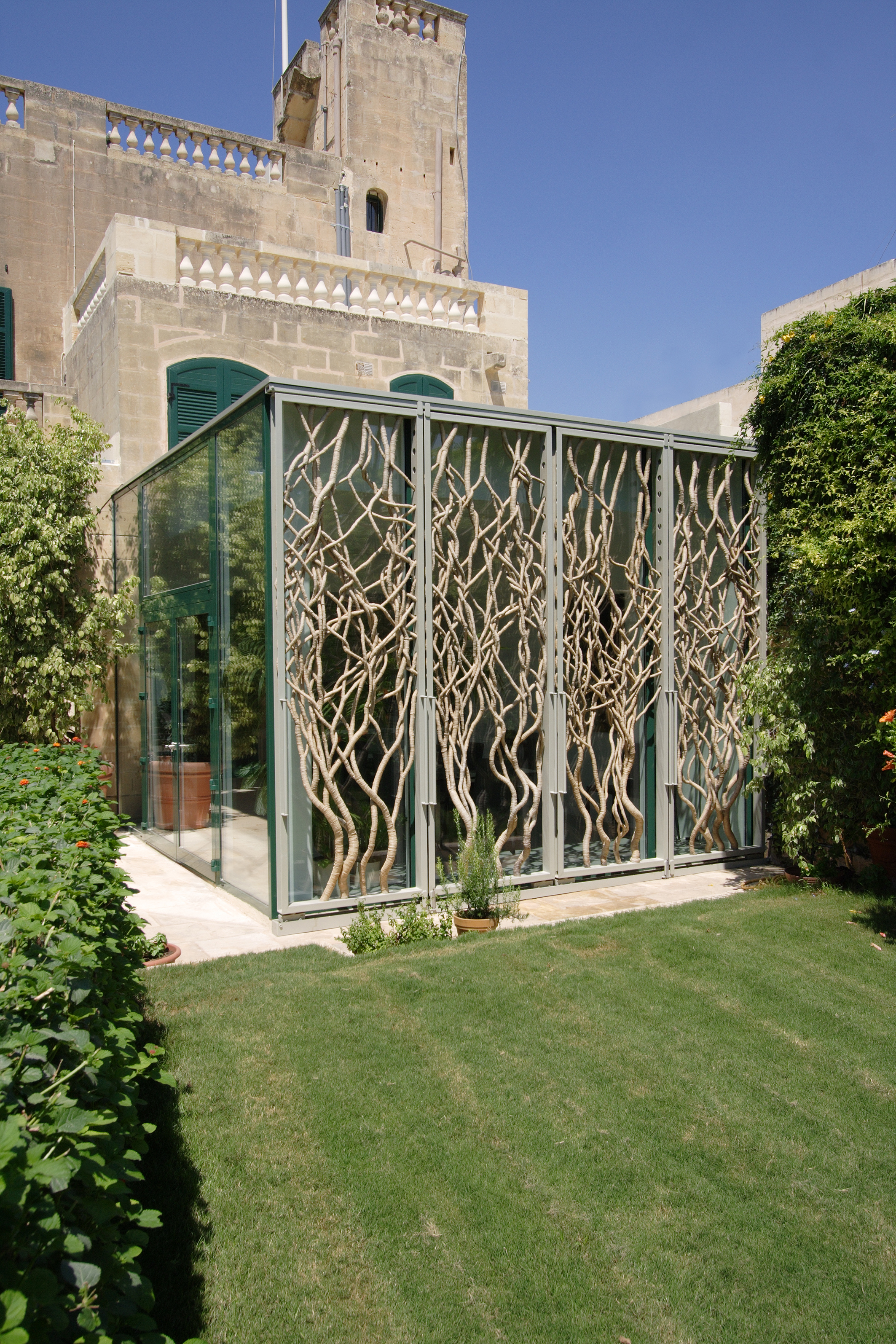 Pavilion-like extension to an eighteenth century house in Malta, with a shading system of flax twisted around hemp, woven onto a steel frame