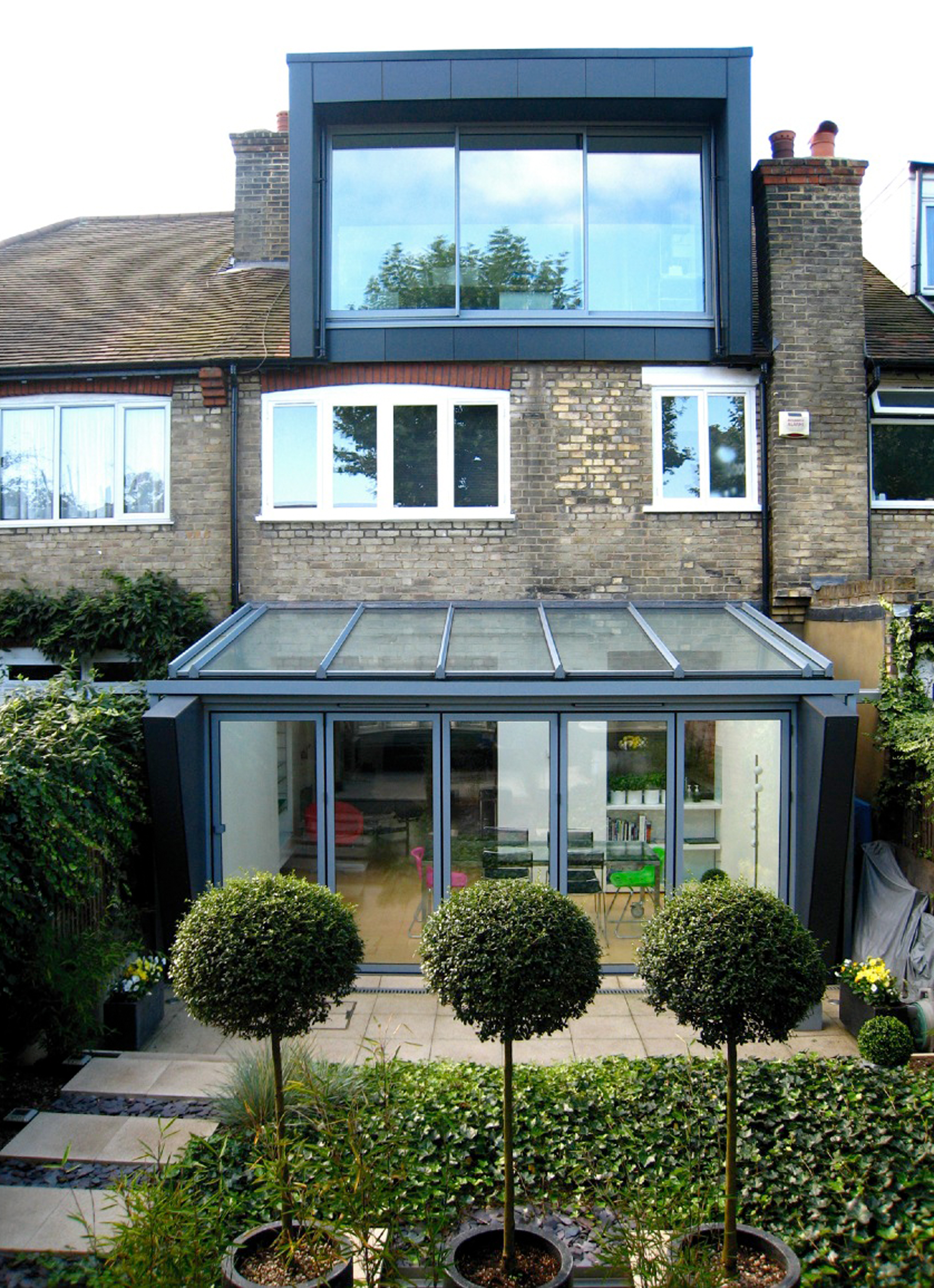 A new open riser staircase leads to the studio in the rebuilt roof space. Full height wall to wall glazed sliding doors and an internal glass balustrade fixed only at floor level give the unobstructed views to the rear. Internally a sliding/folding door divides the space to create a separately accessed guest room with ensuite shower room when required.