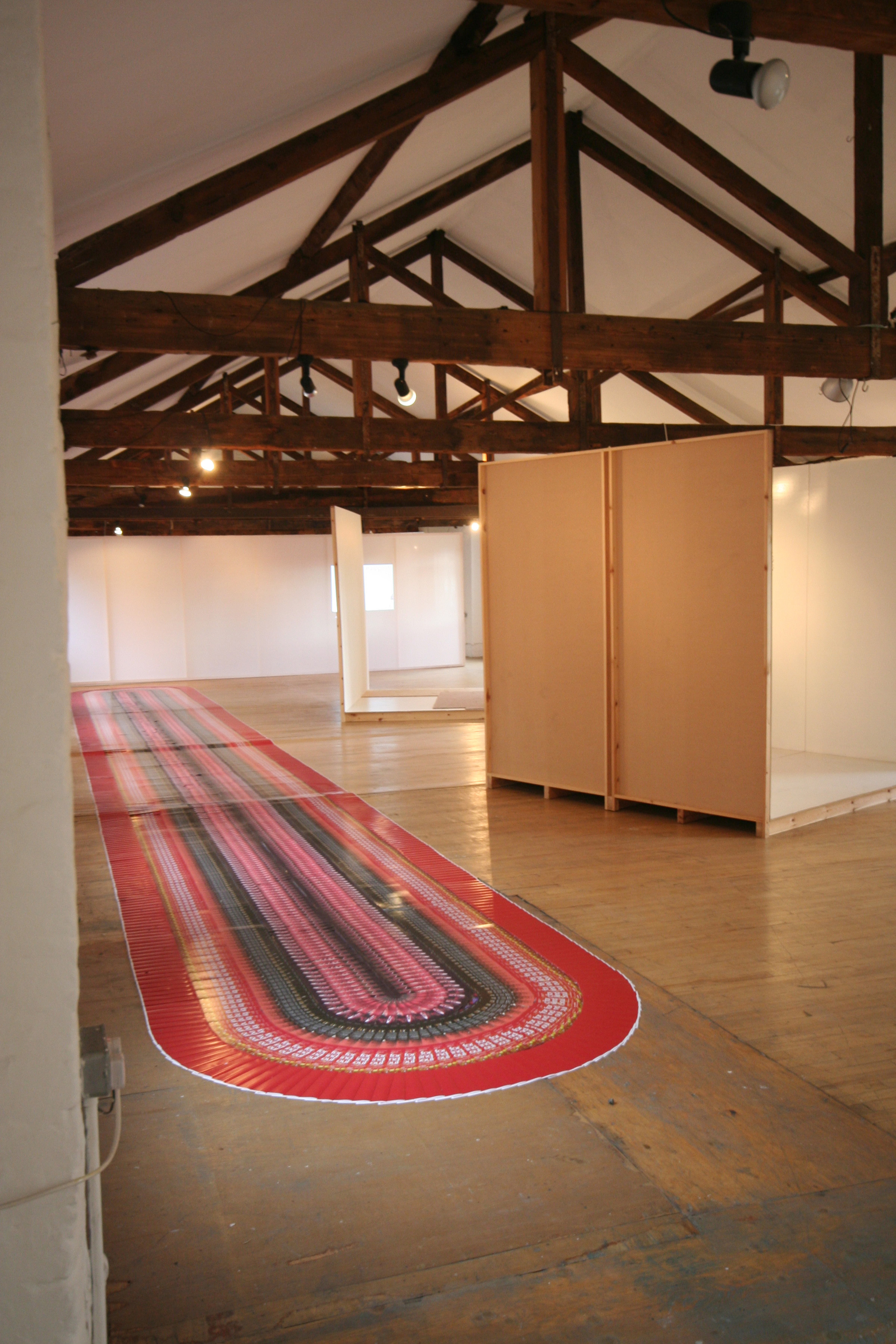 It consists of a large table, a fixed solid wall, a moveable fabric screen and a cube, white on the inside, unfinished on the outside. These elements allow for the space that has no flat walls and a multitude of windows to be reconfigured for each show, making intimate spaces for small works, dividing the hall space into different environments for group shows, or compressing the space for smaller shows.