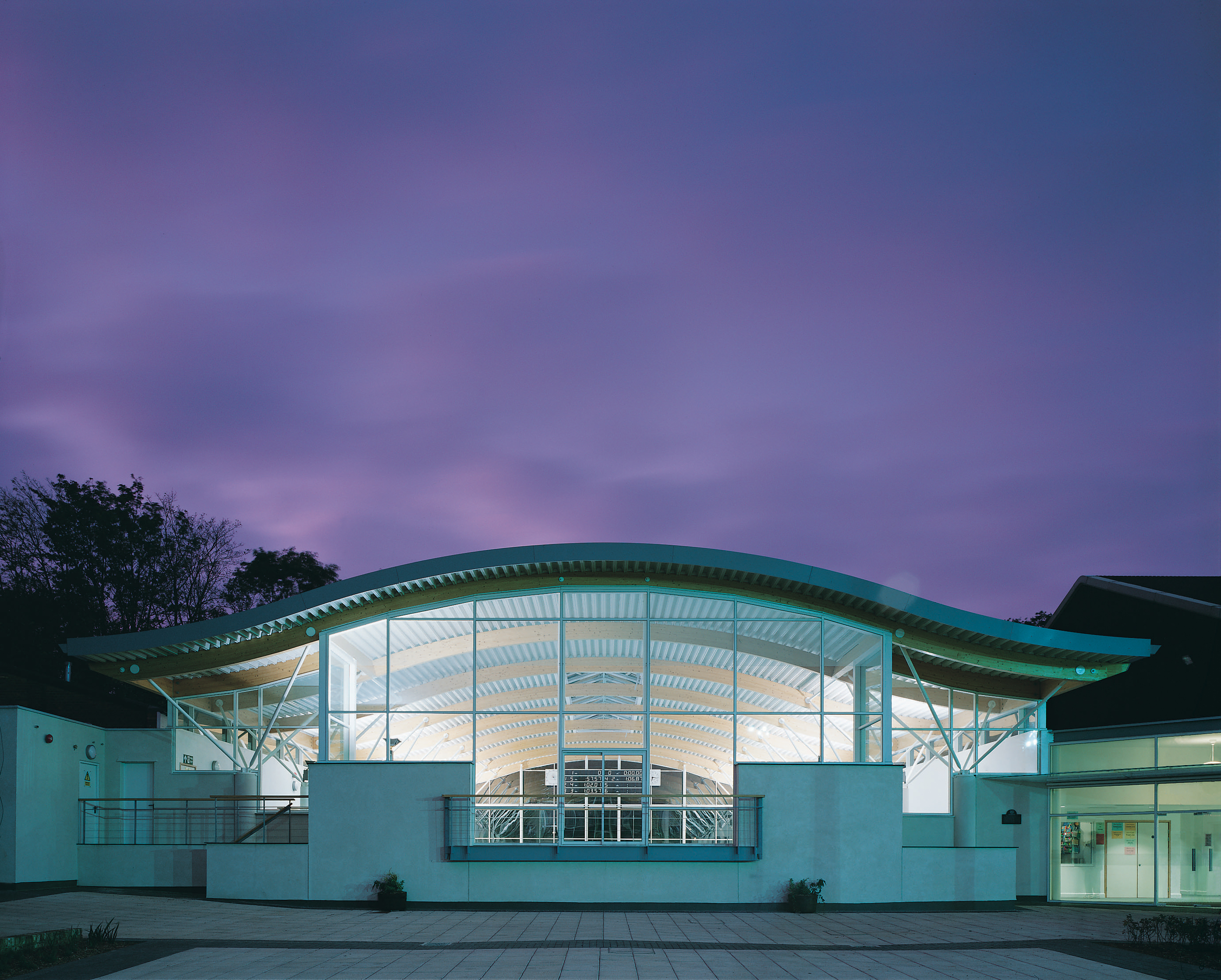 The building is naturally lit, rarely needing artificial light during the day. The structure is exposed with steel 'tree' supports holding the laminated Swedish timber roof beamd which shape the lightweight, profiled steel cladding roof. The changing rooms are built as solid masonry.