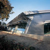 The curved roof profile and the glazed wall give the building a dramatic look at night