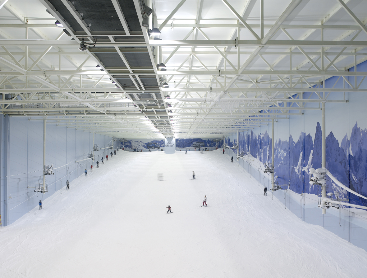 Indoor ski slope, including a main slope, learners slope and toboggan run alongside a warm-side zone containing bars, restaurants and shops