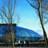 The building is conceived of as an extrusion of two elements. There is a linear horizontal block, which is clad in black insulating sheet material holding huge sheets of solar-shading capillary glass. These are punctuated with a series of horizontal and vertical windows-within-windows that allow the users a glimpse out.