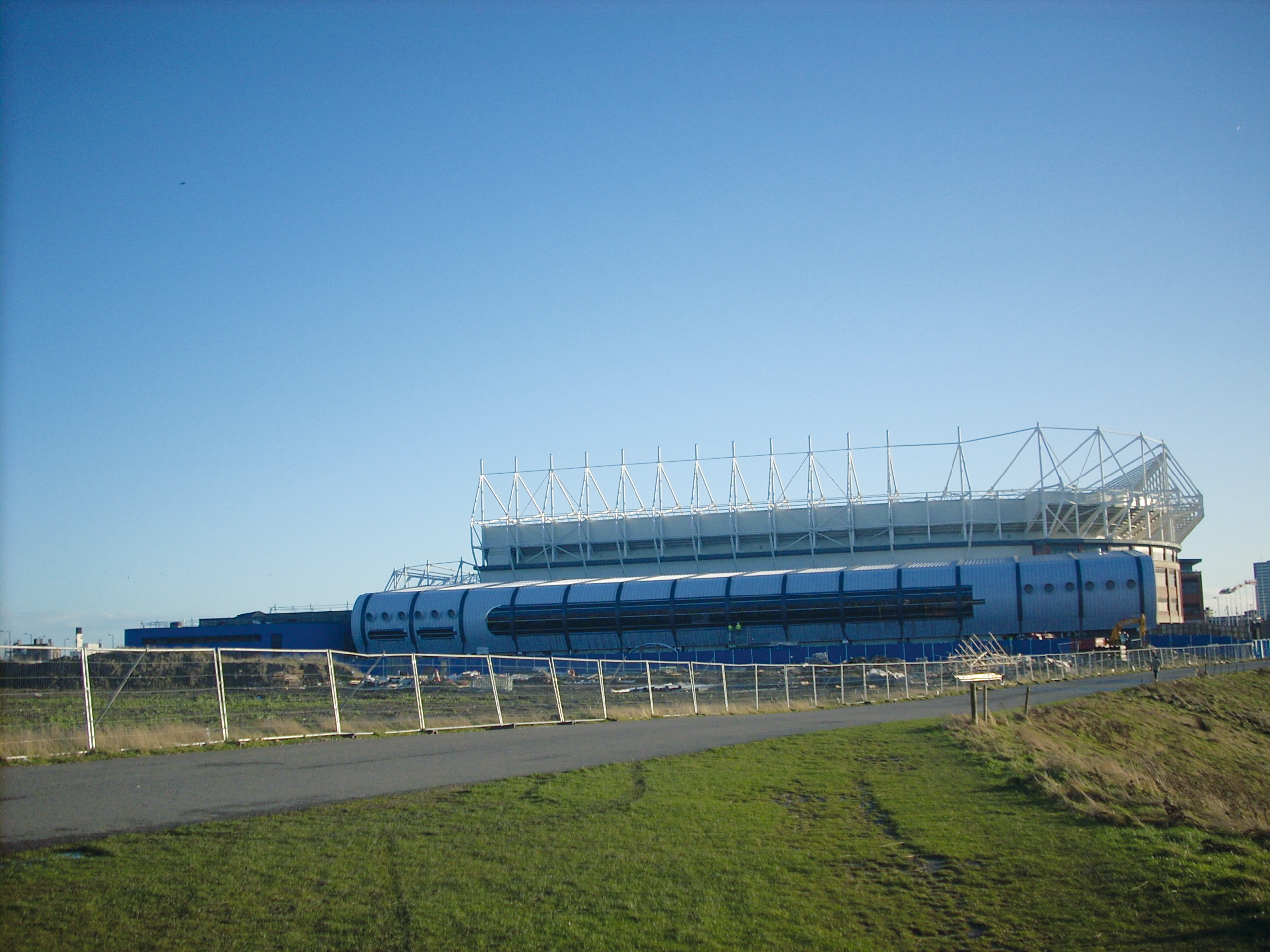 50-metre swimming pool wrapped in a long, flattened, aluminium-clad tube, tucked in against the north side of the Sunderland football stadium